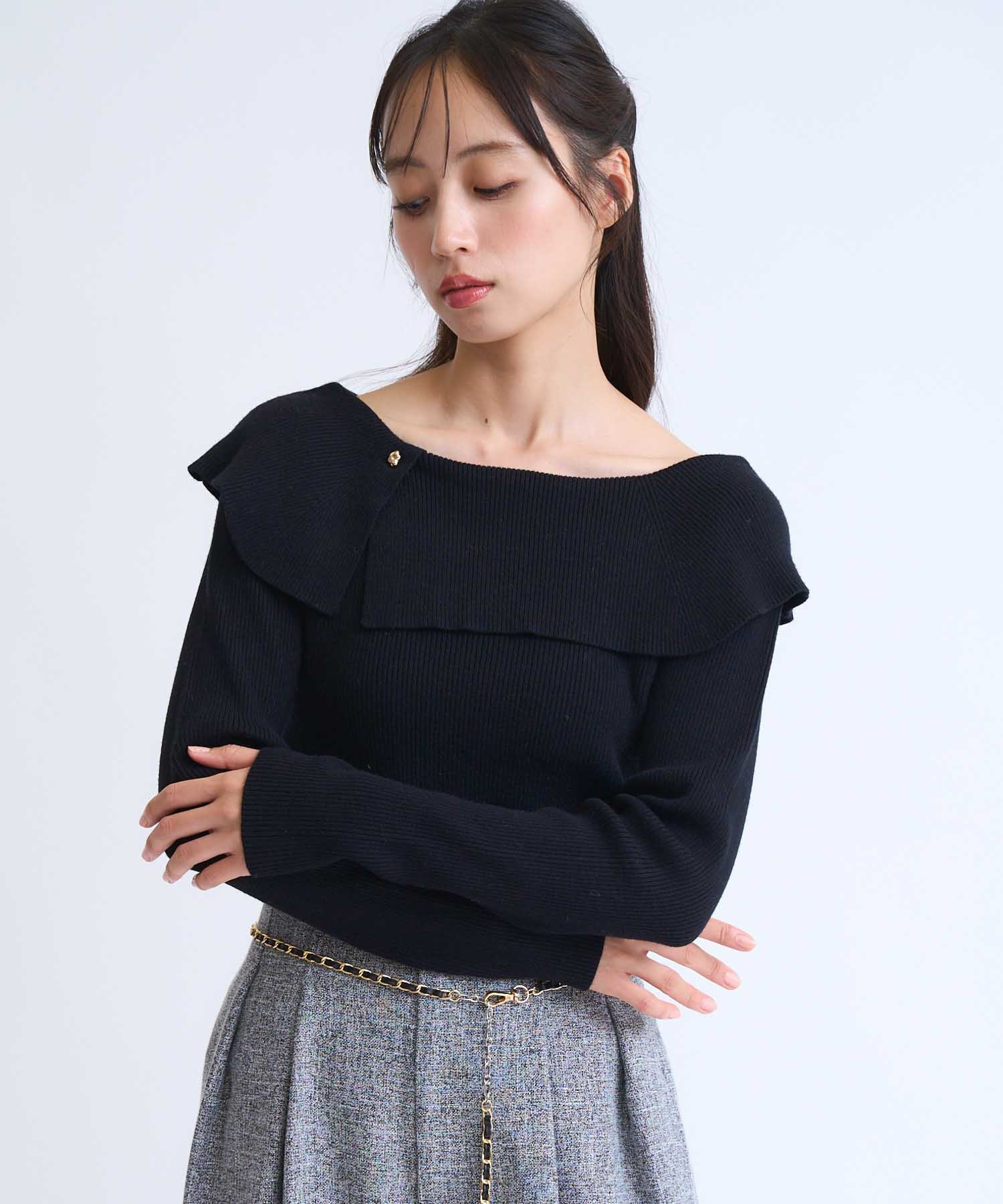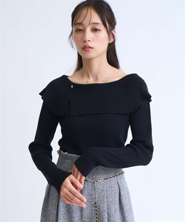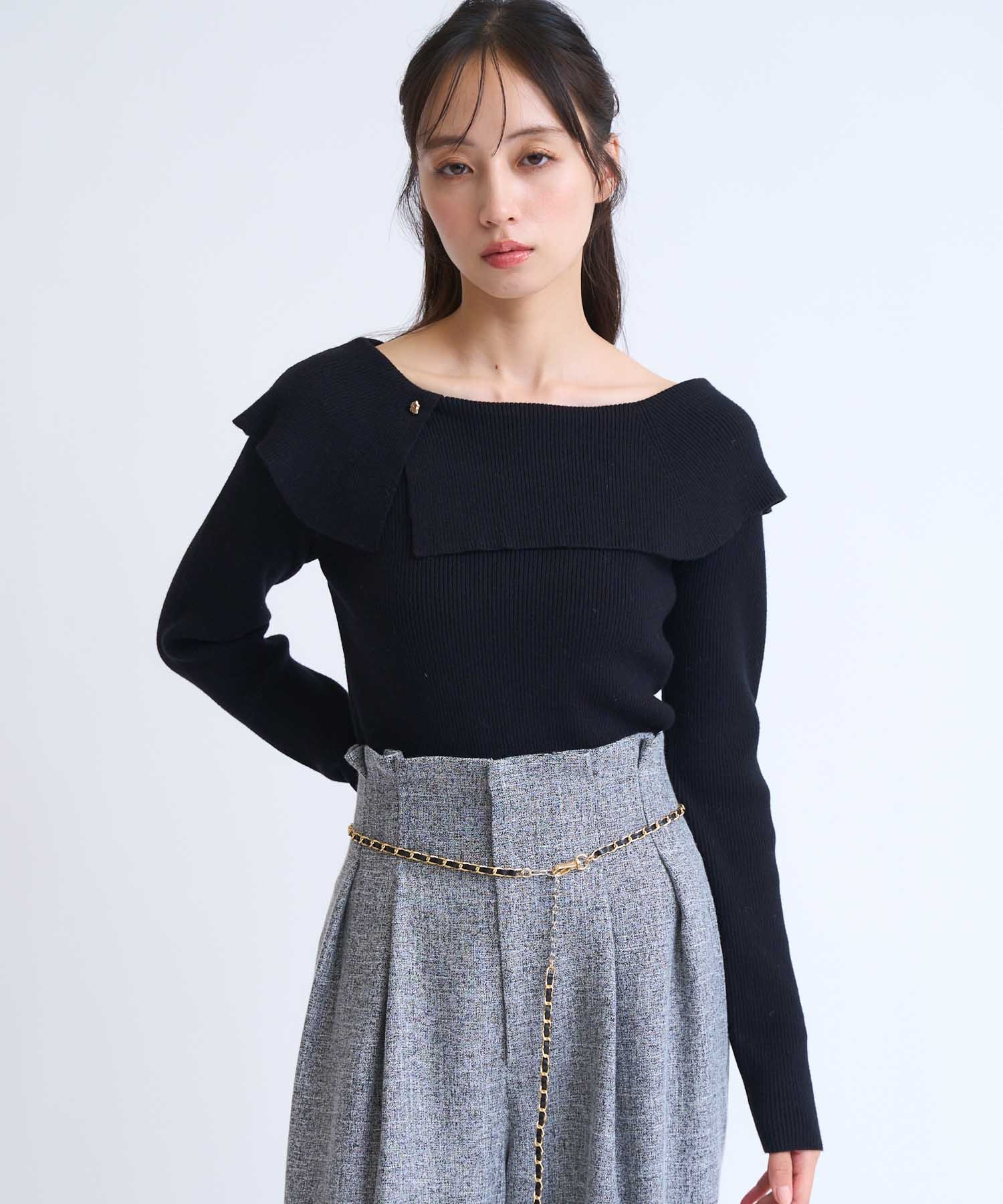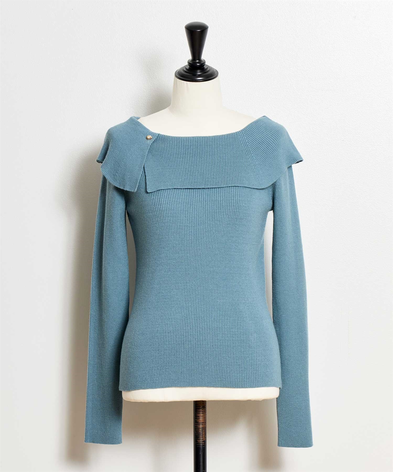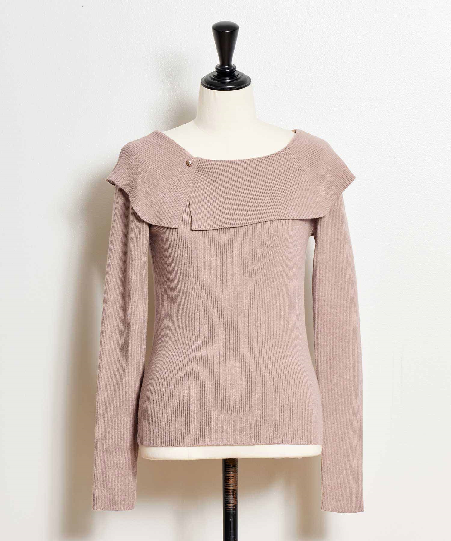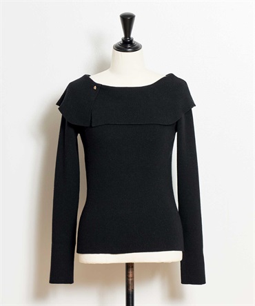アシンメトリーなケープデザインが印象的なリブニットトップス。