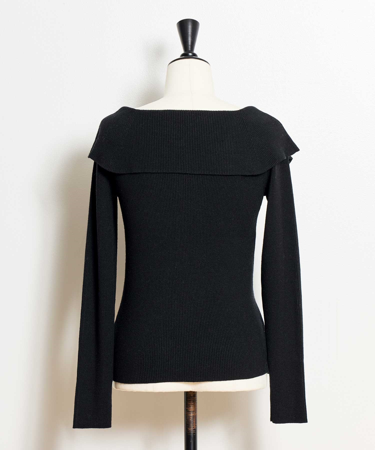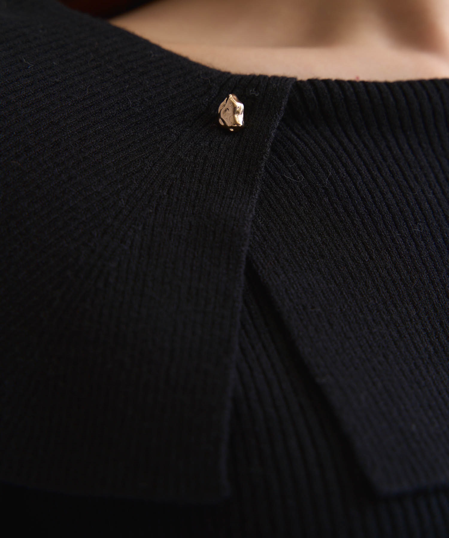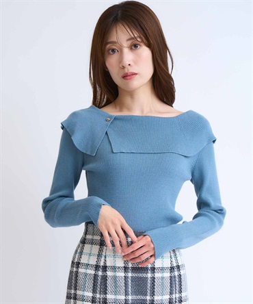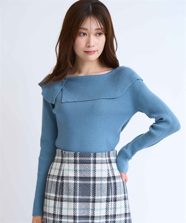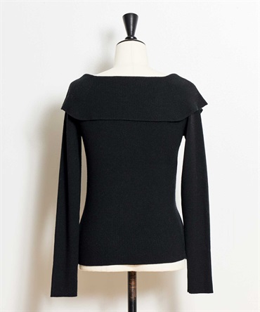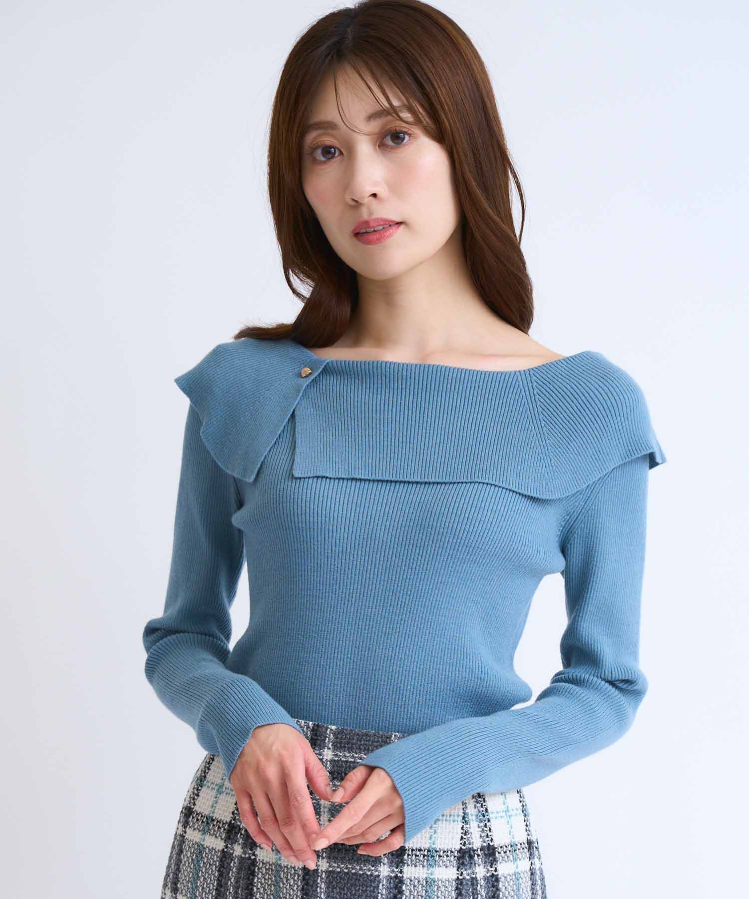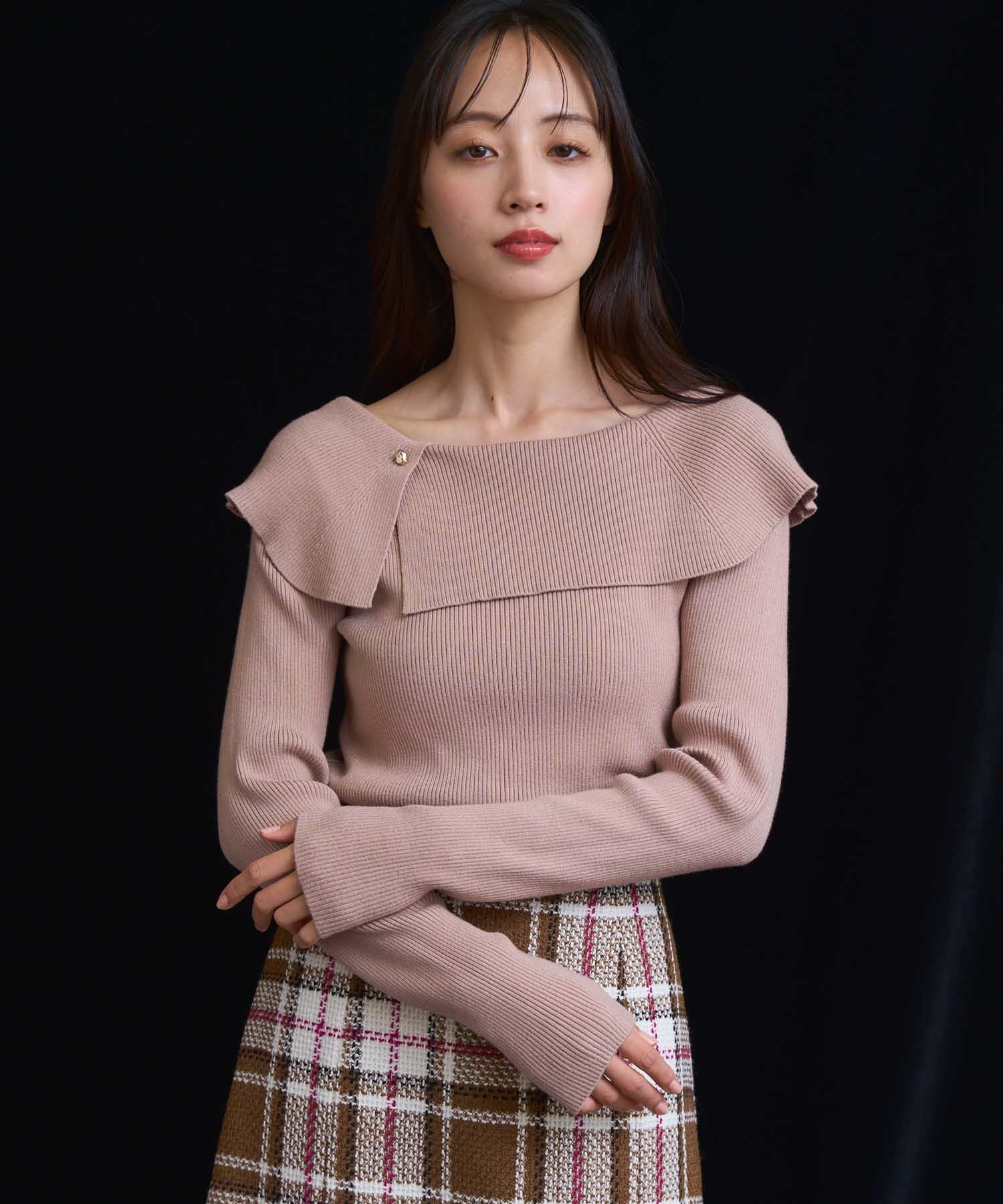 アシンメトリーなケープデザインが印象的なリブニットトップス。