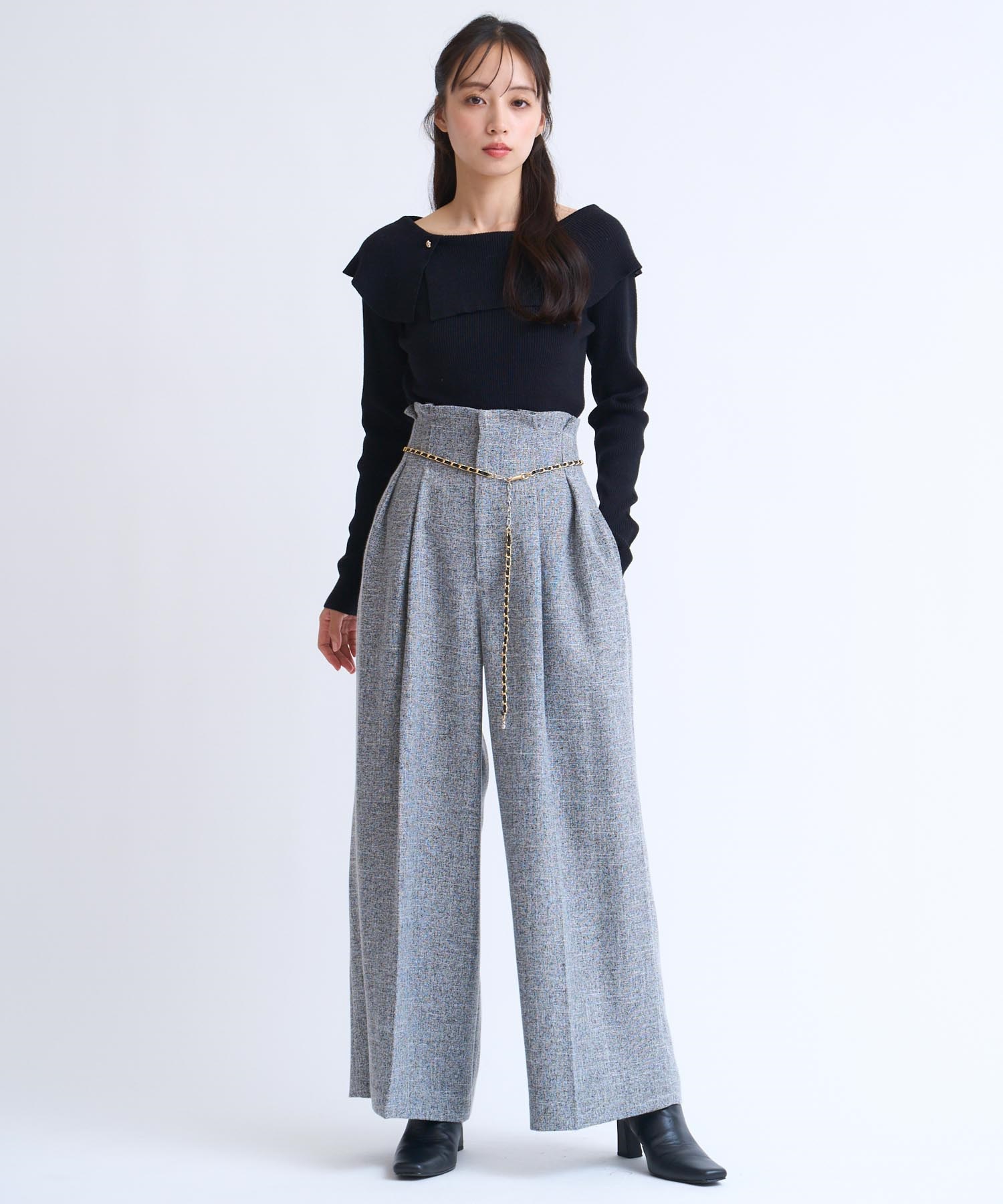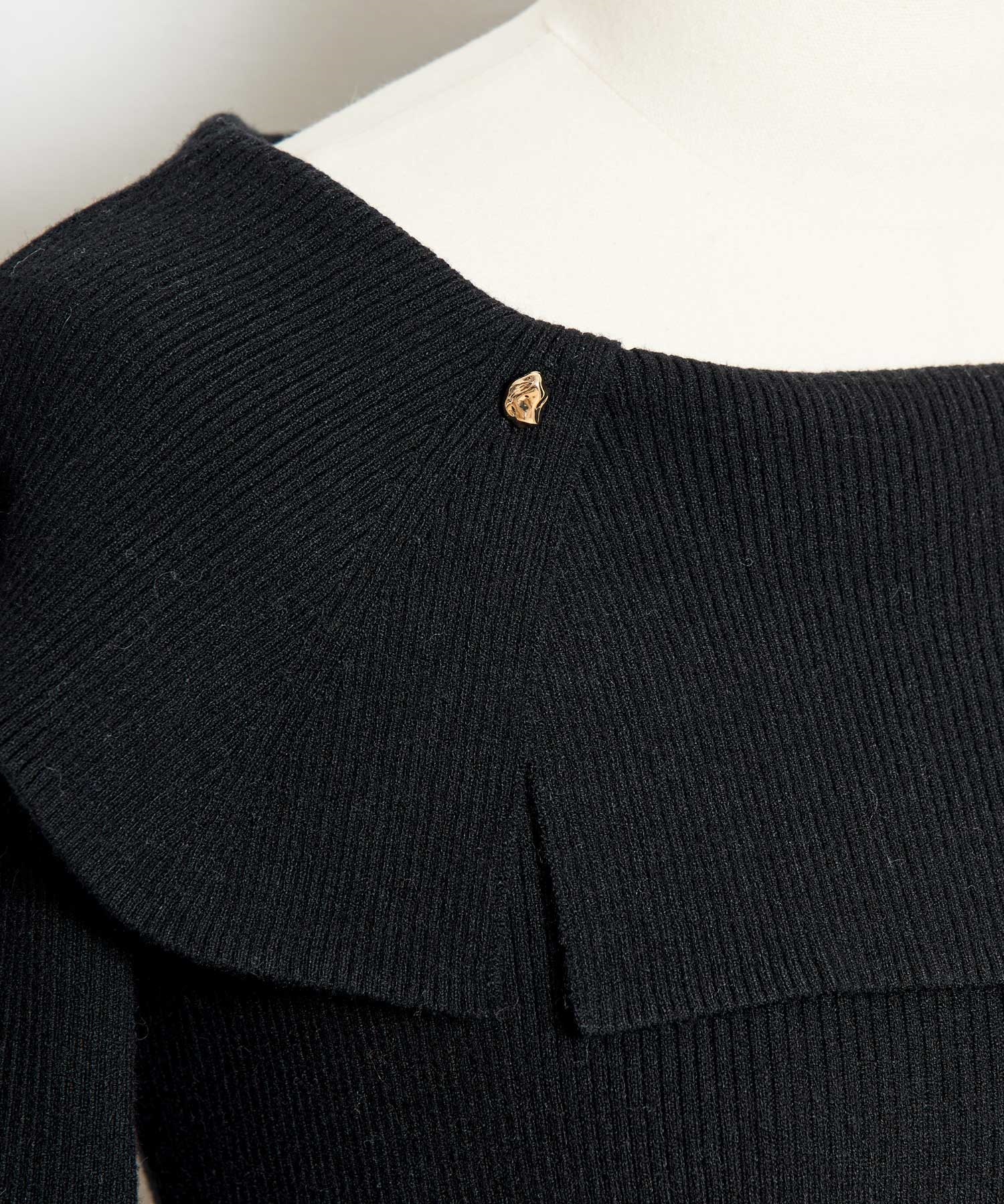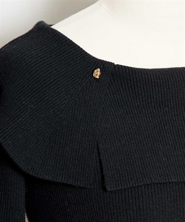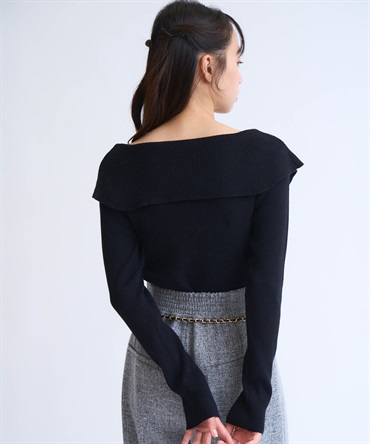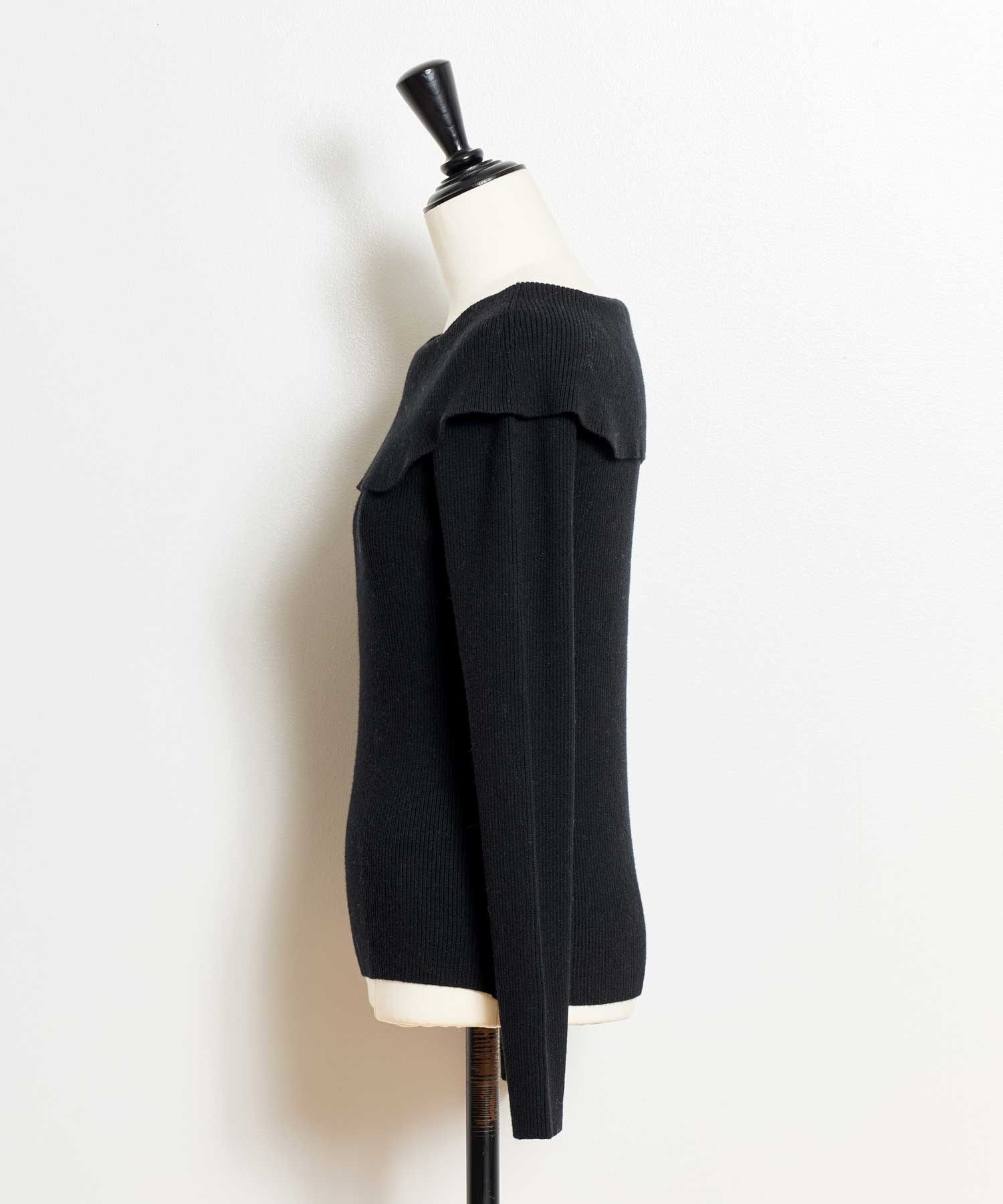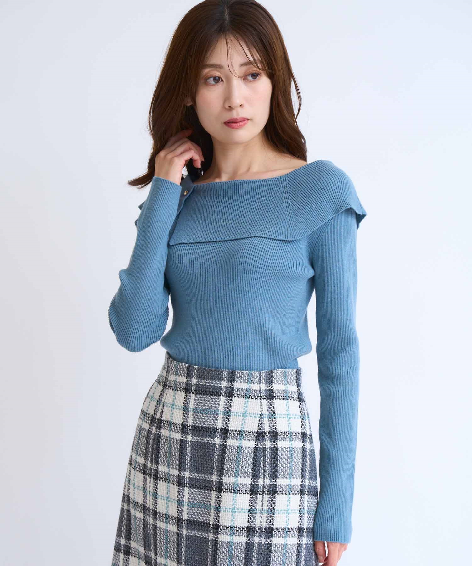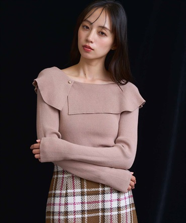 アシンメトリーなケープデザインが印象的なリブニットトップス。