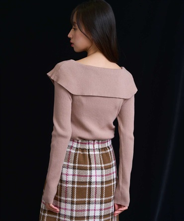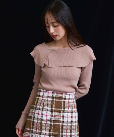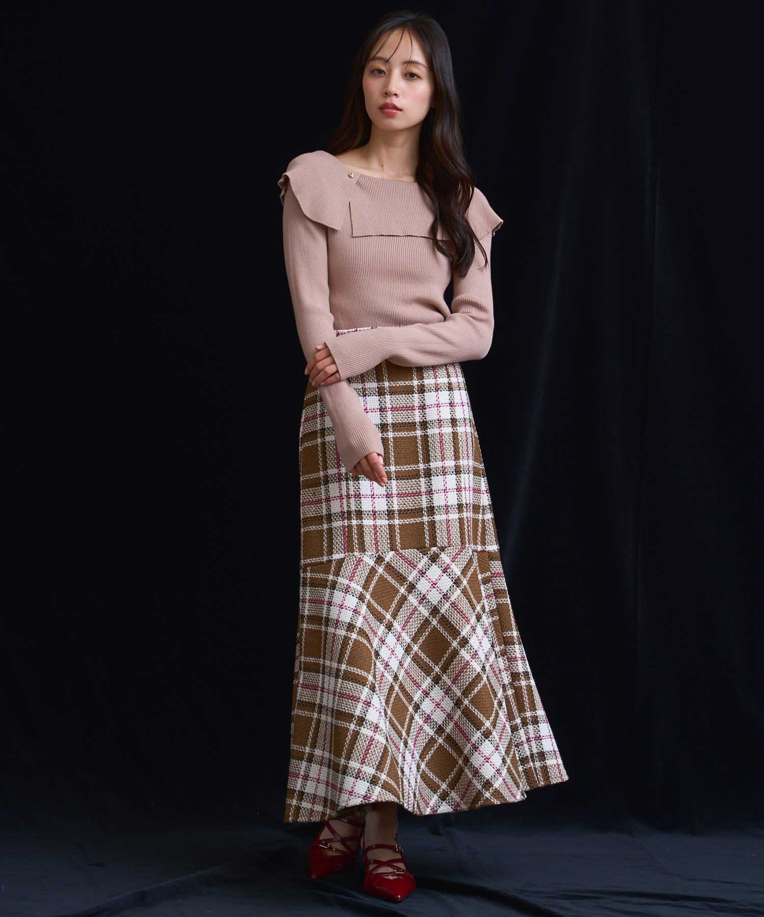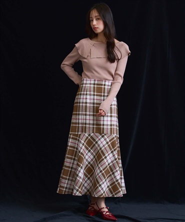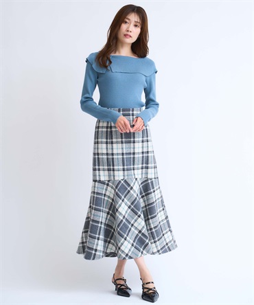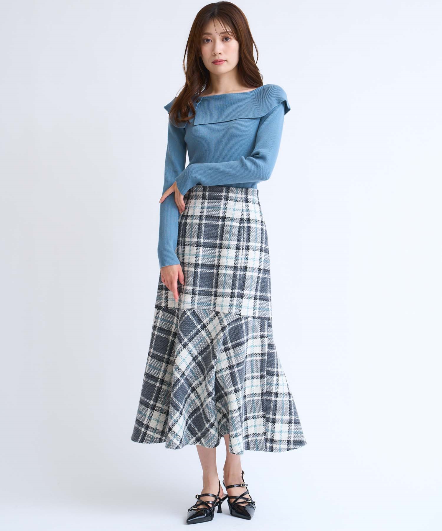 チェック柄のマーメイドスカートと合わせれば、女性らしさを引き立てる上品なスタイリングが完成します。