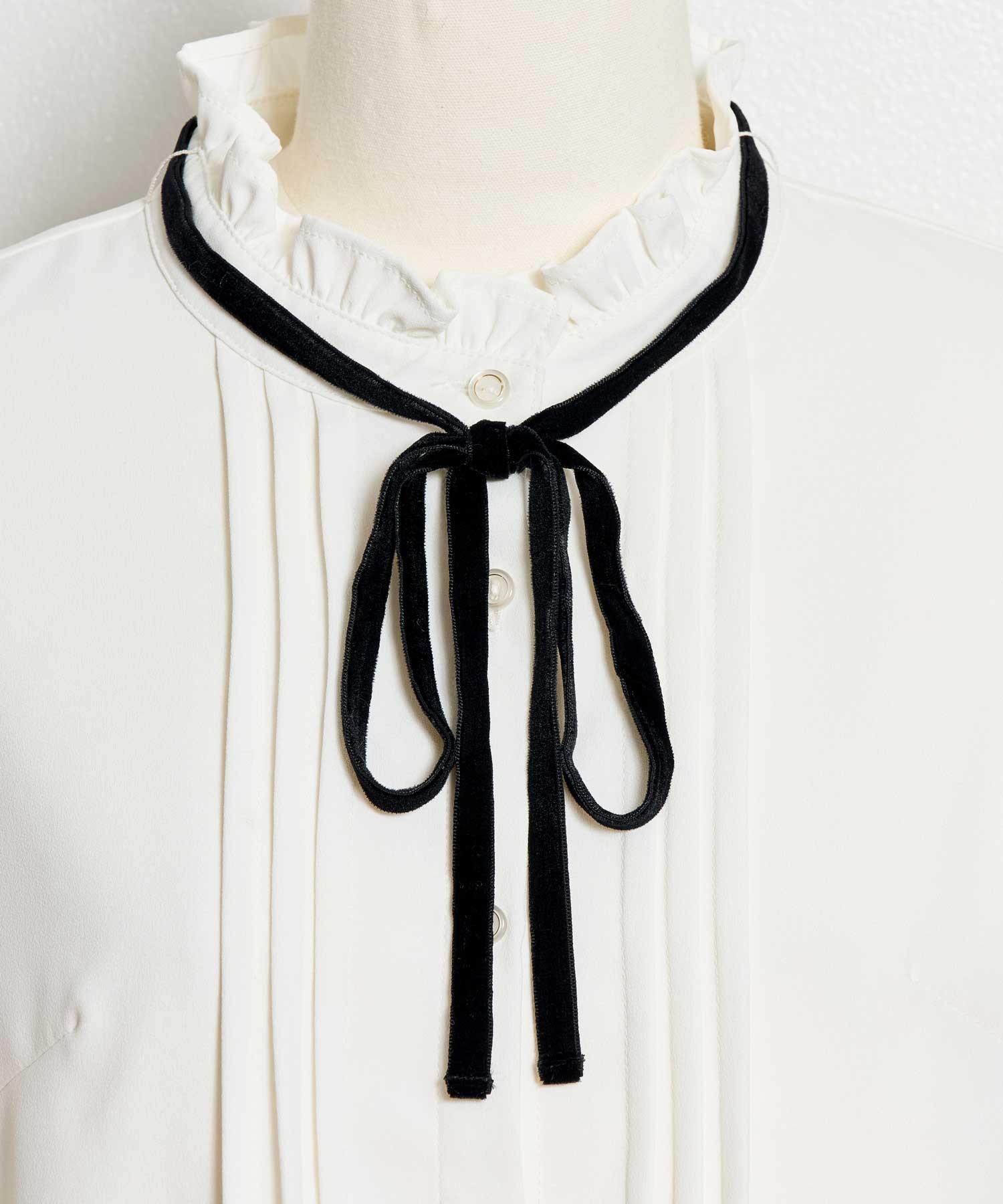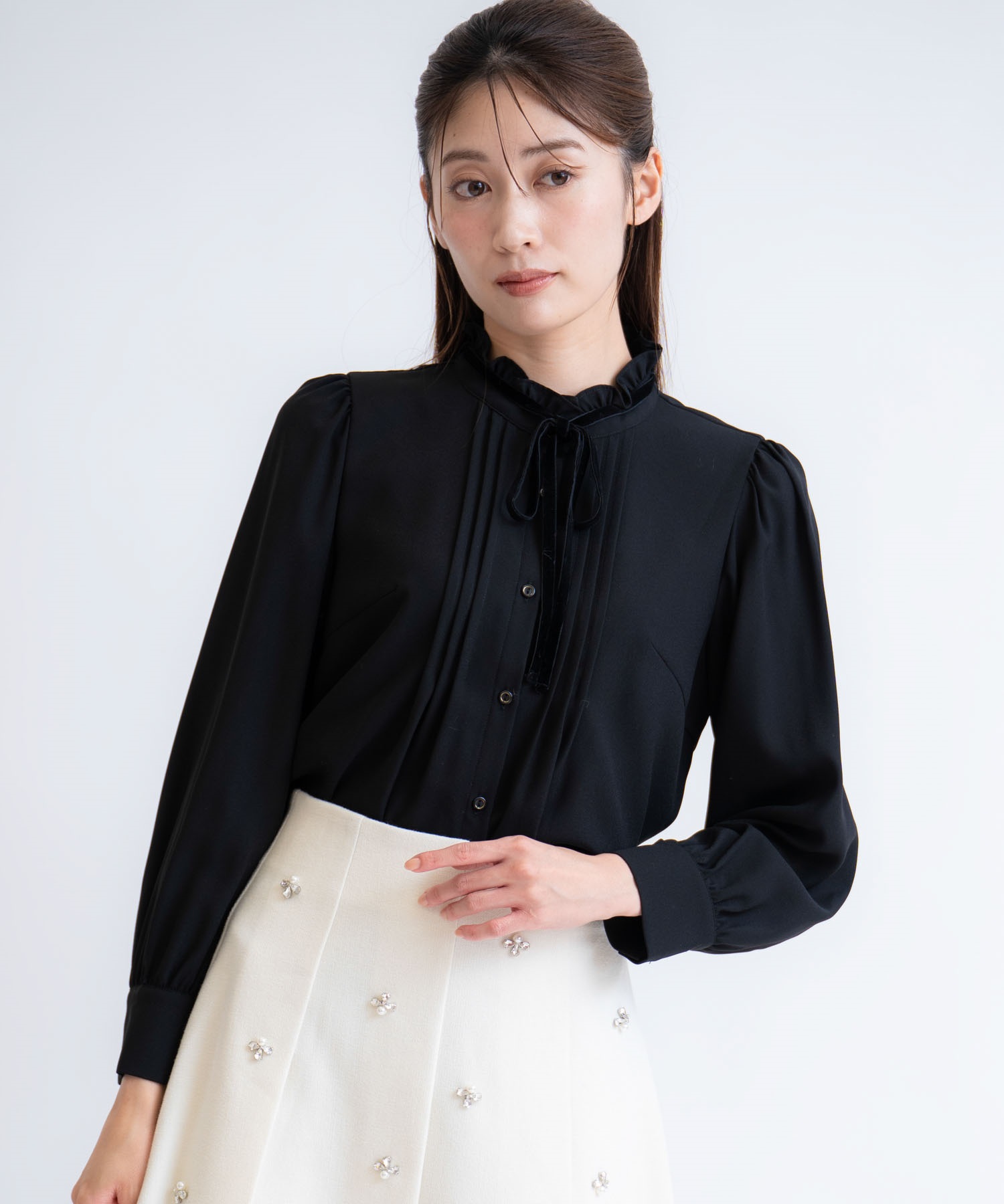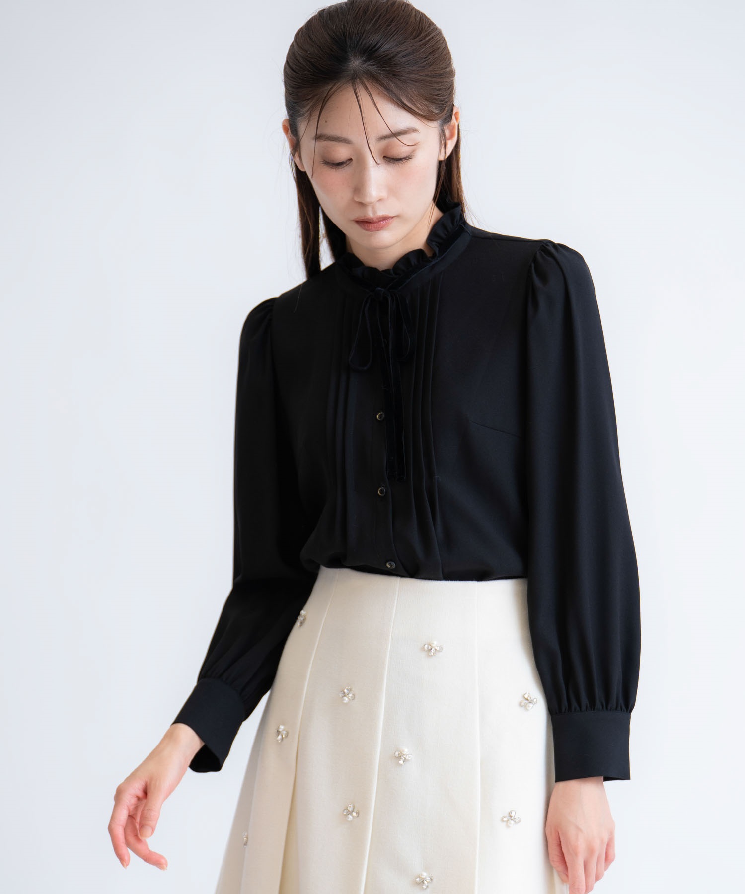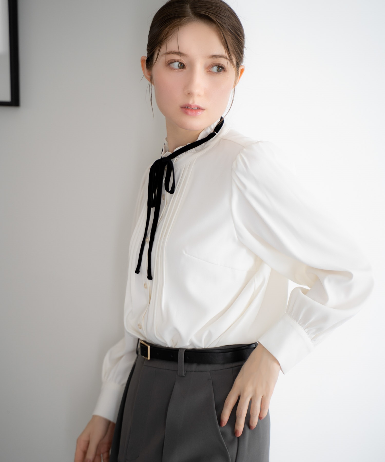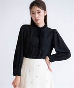 ピンタックをあしらった、上品で丁寧な仕立てのボウタイブラウス。