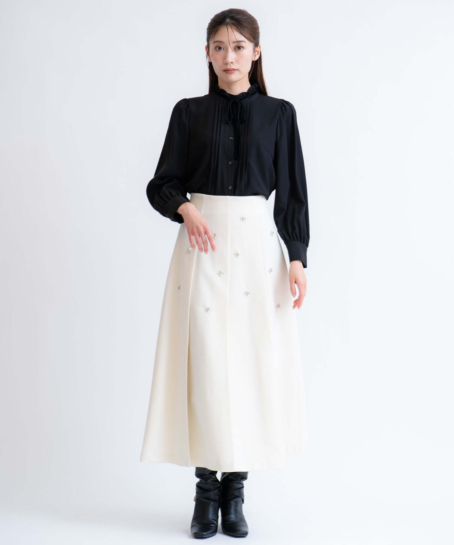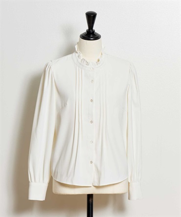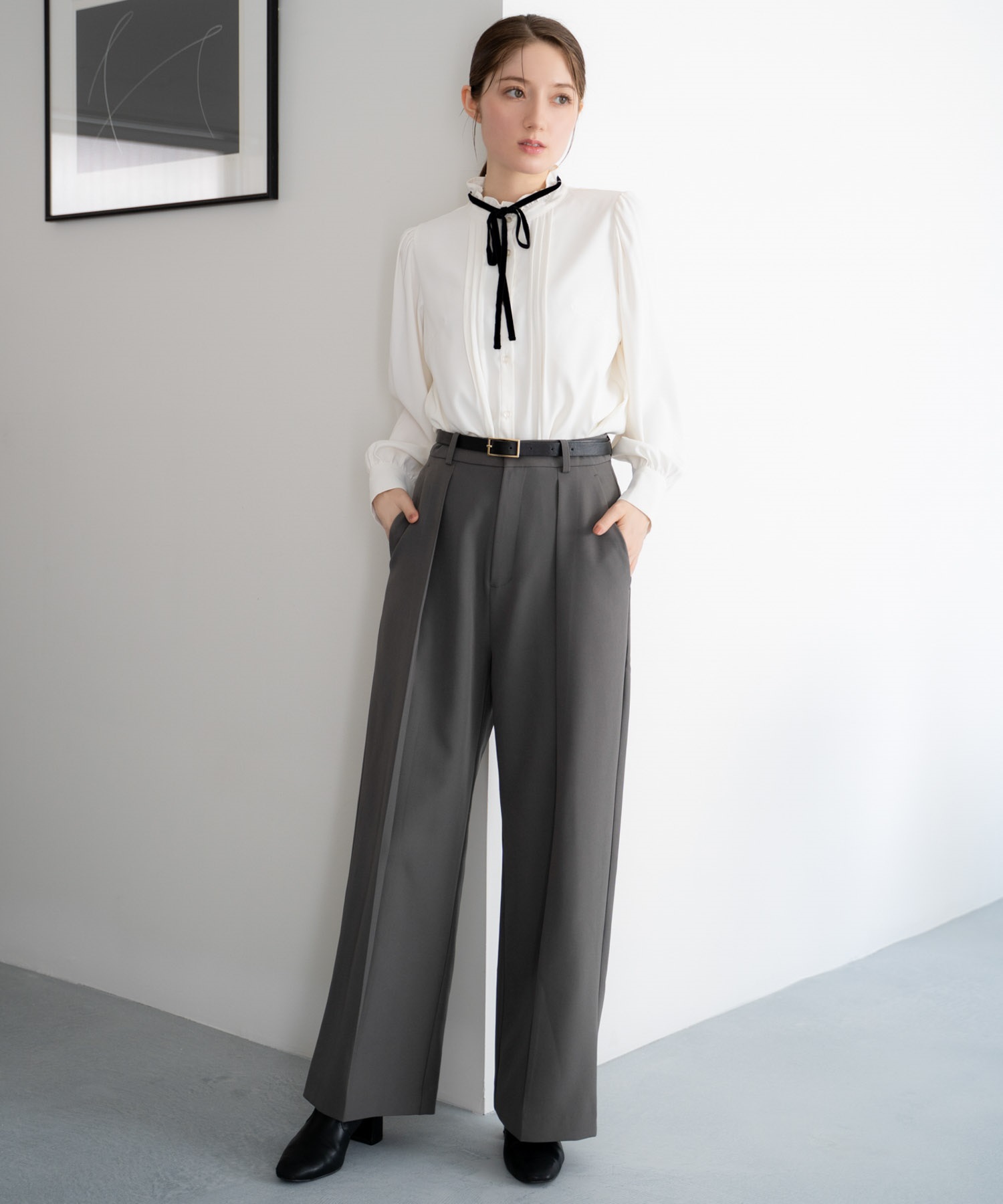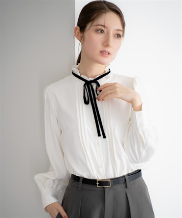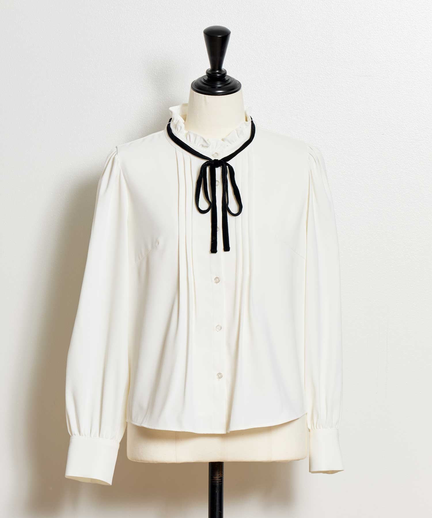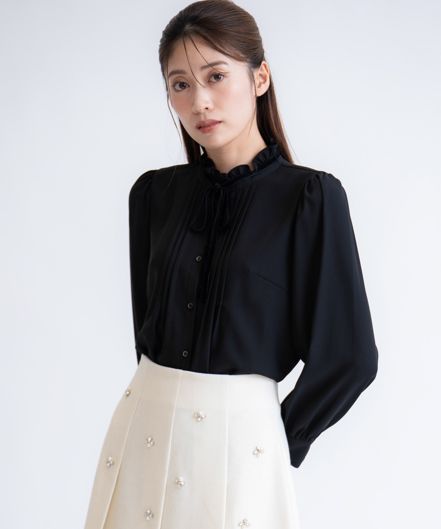 ピンタックをあしらった、上品で丁寧な仕立てのボウタイブラウス。