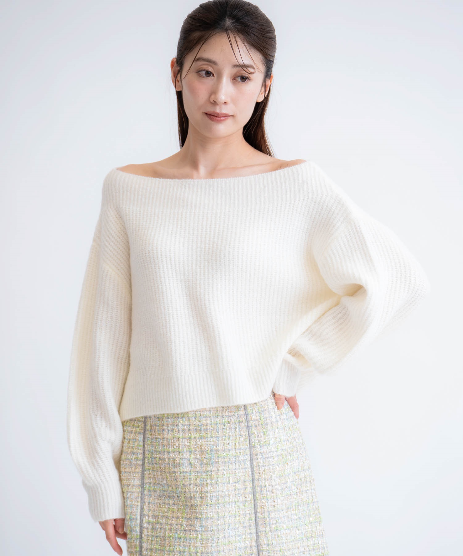肩に乗せてもオフショルにしても着られる2WAYニット。