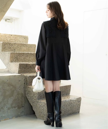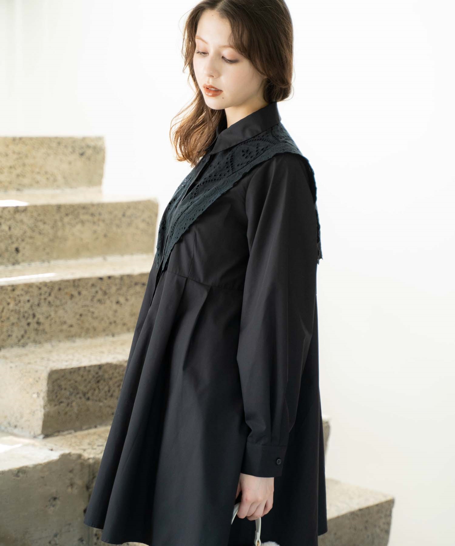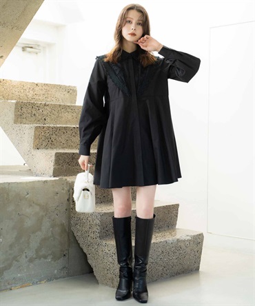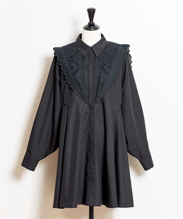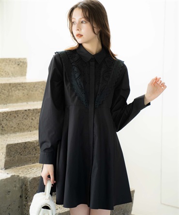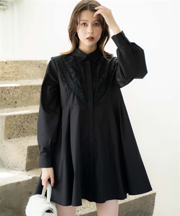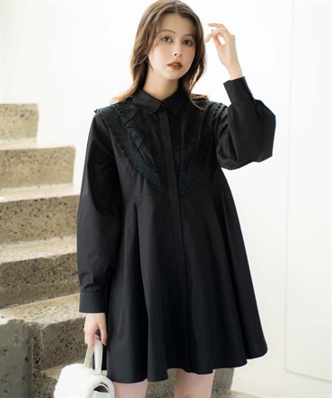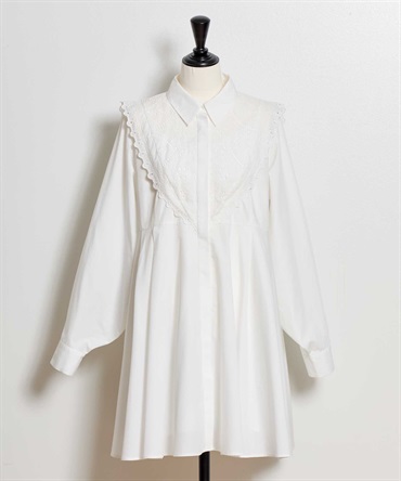 胸元のレトロなレースがさりげなく甘さを添える、Aラインのミニ丈シャツワンピース。