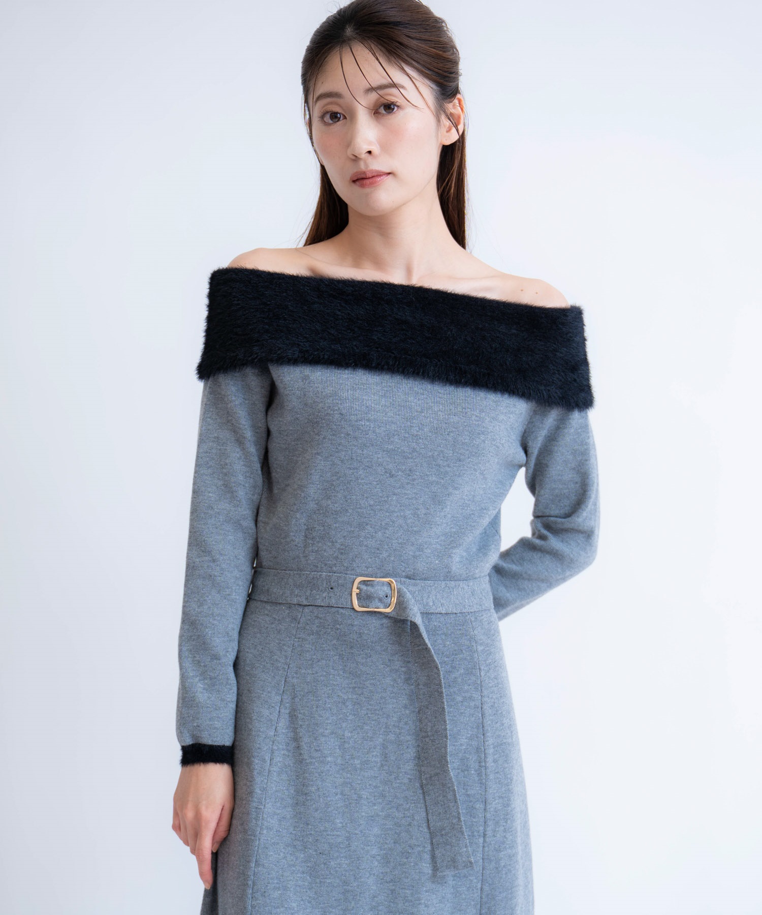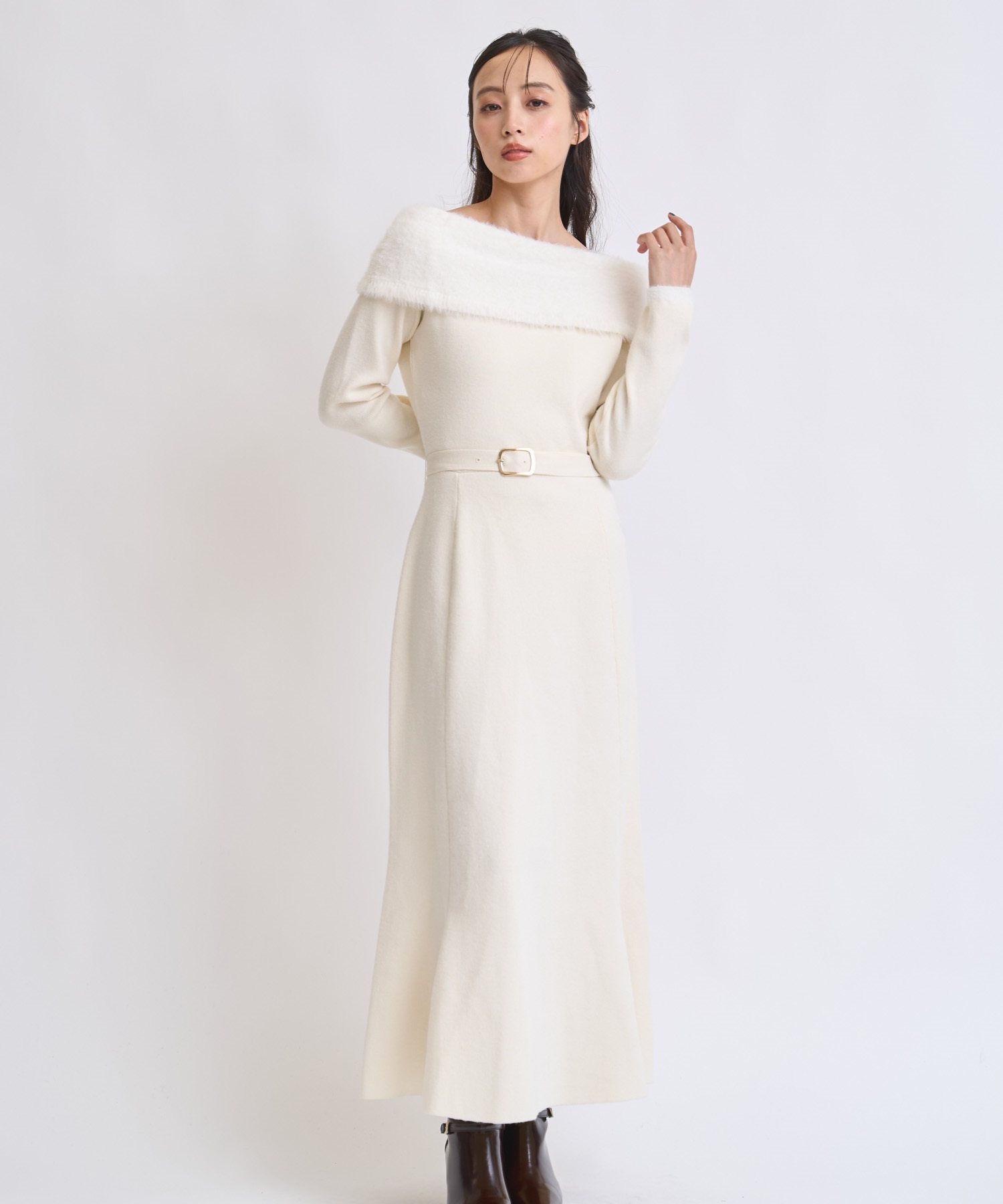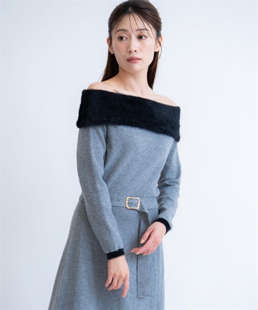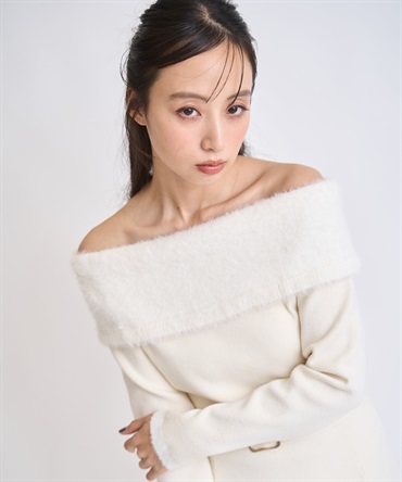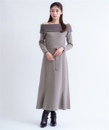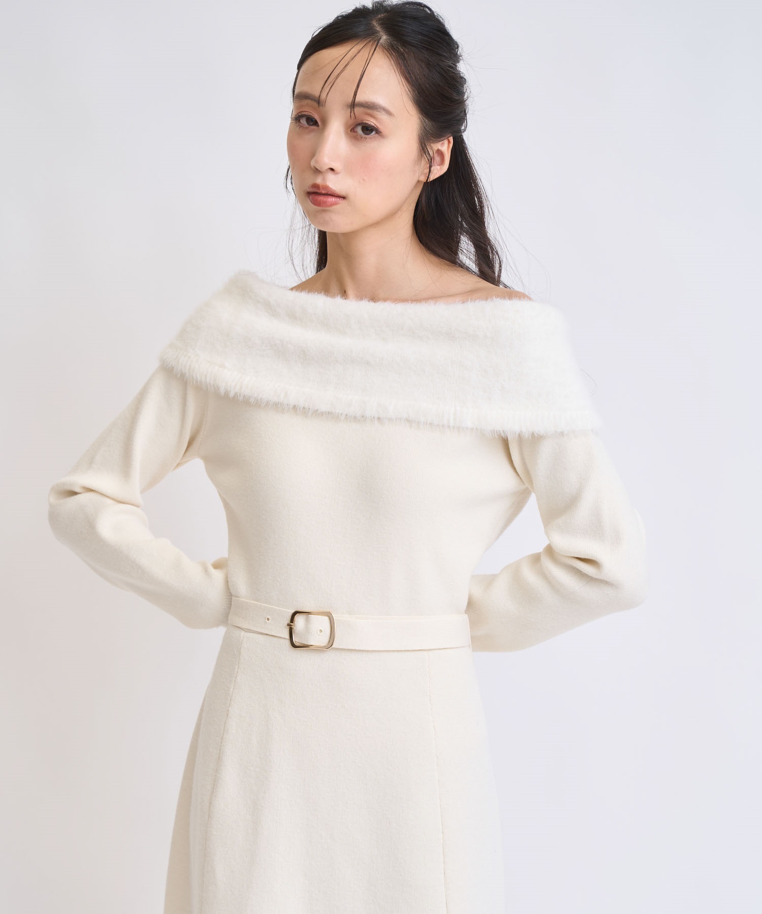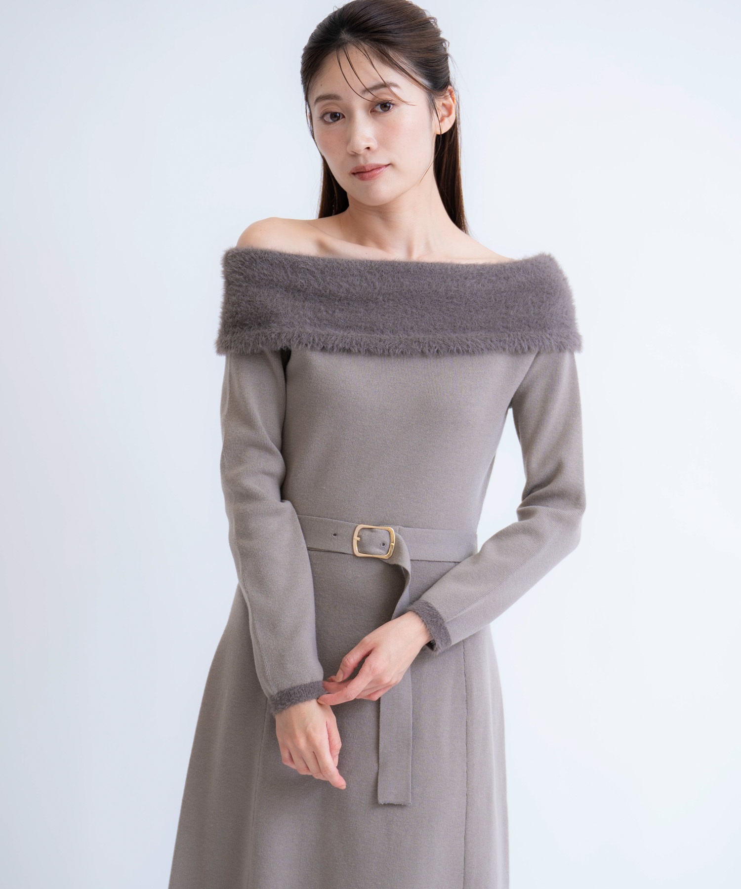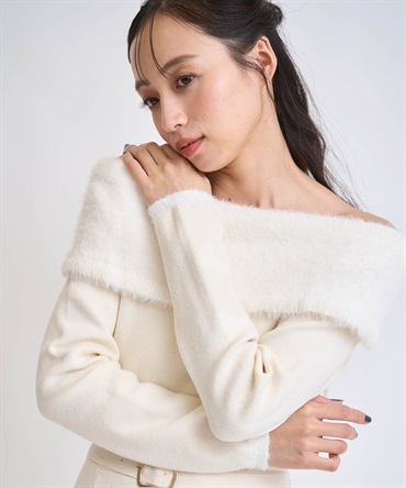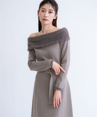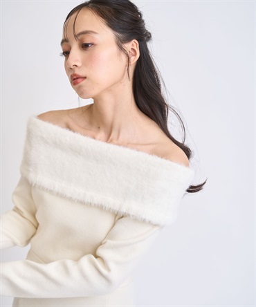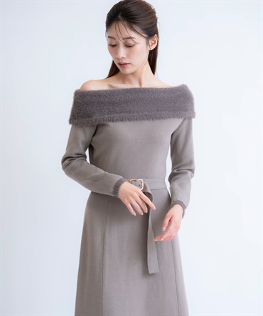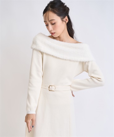 フェザーのオフショルデザインが顔まわりを華やかに見せるニットワンピース。