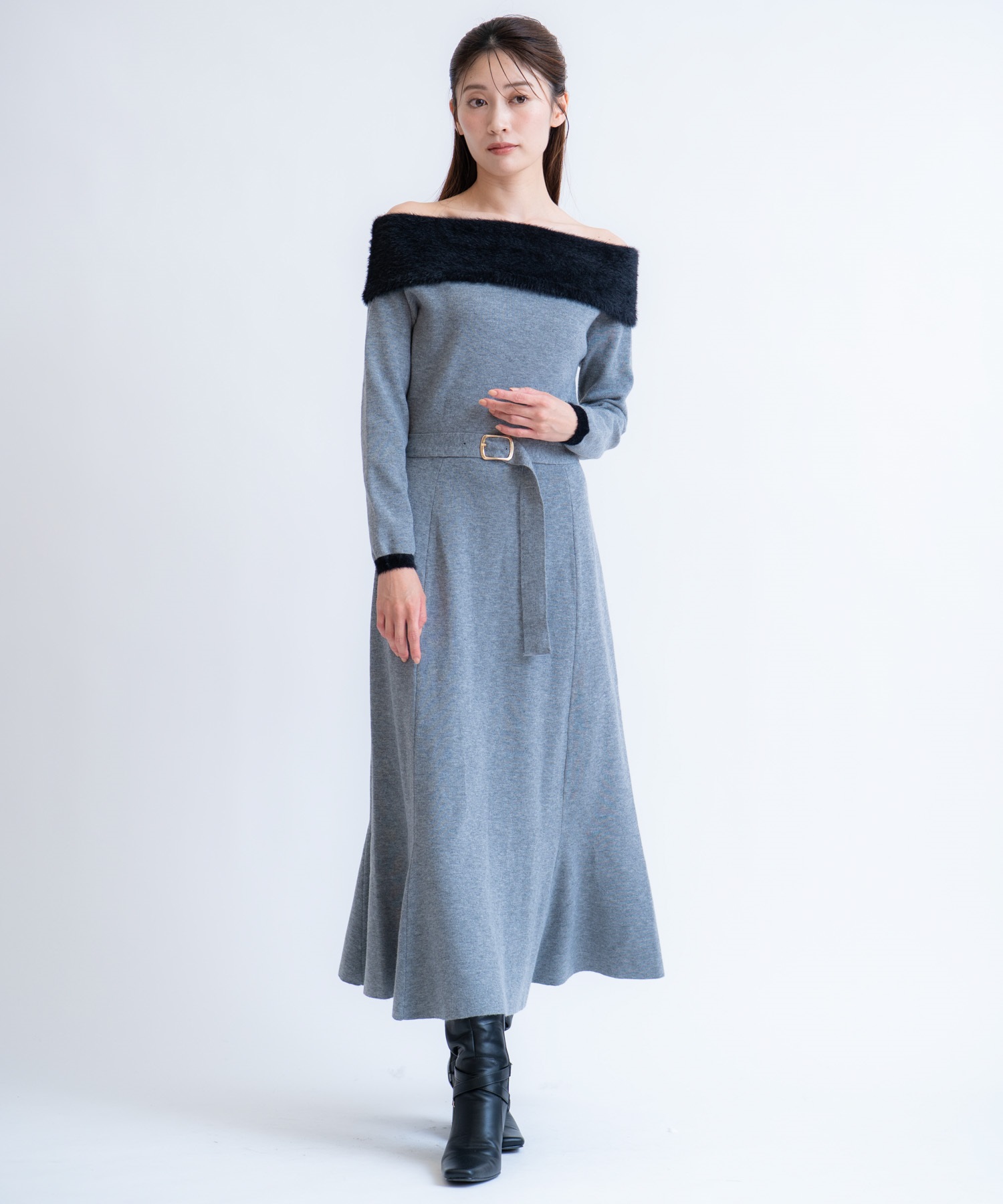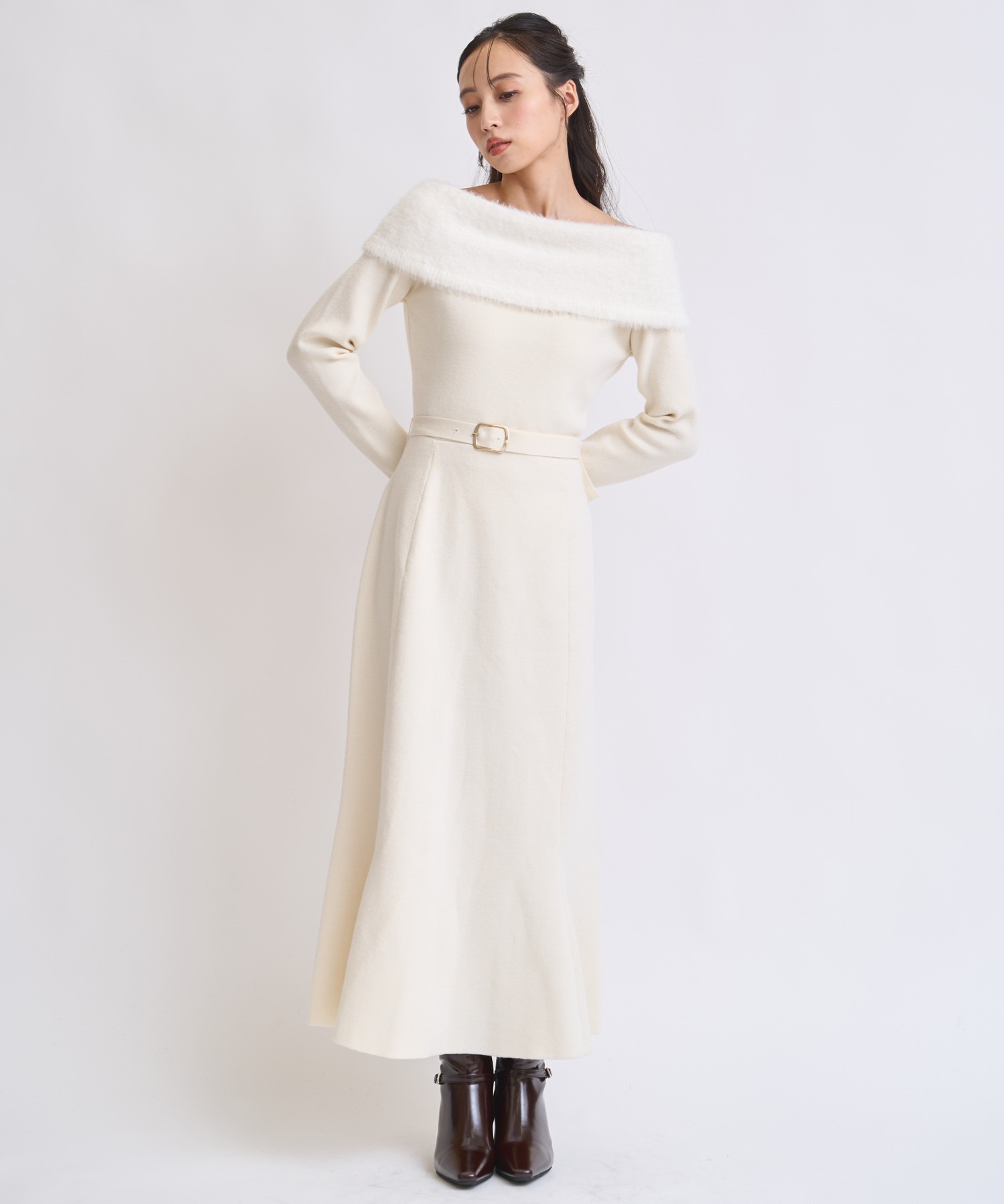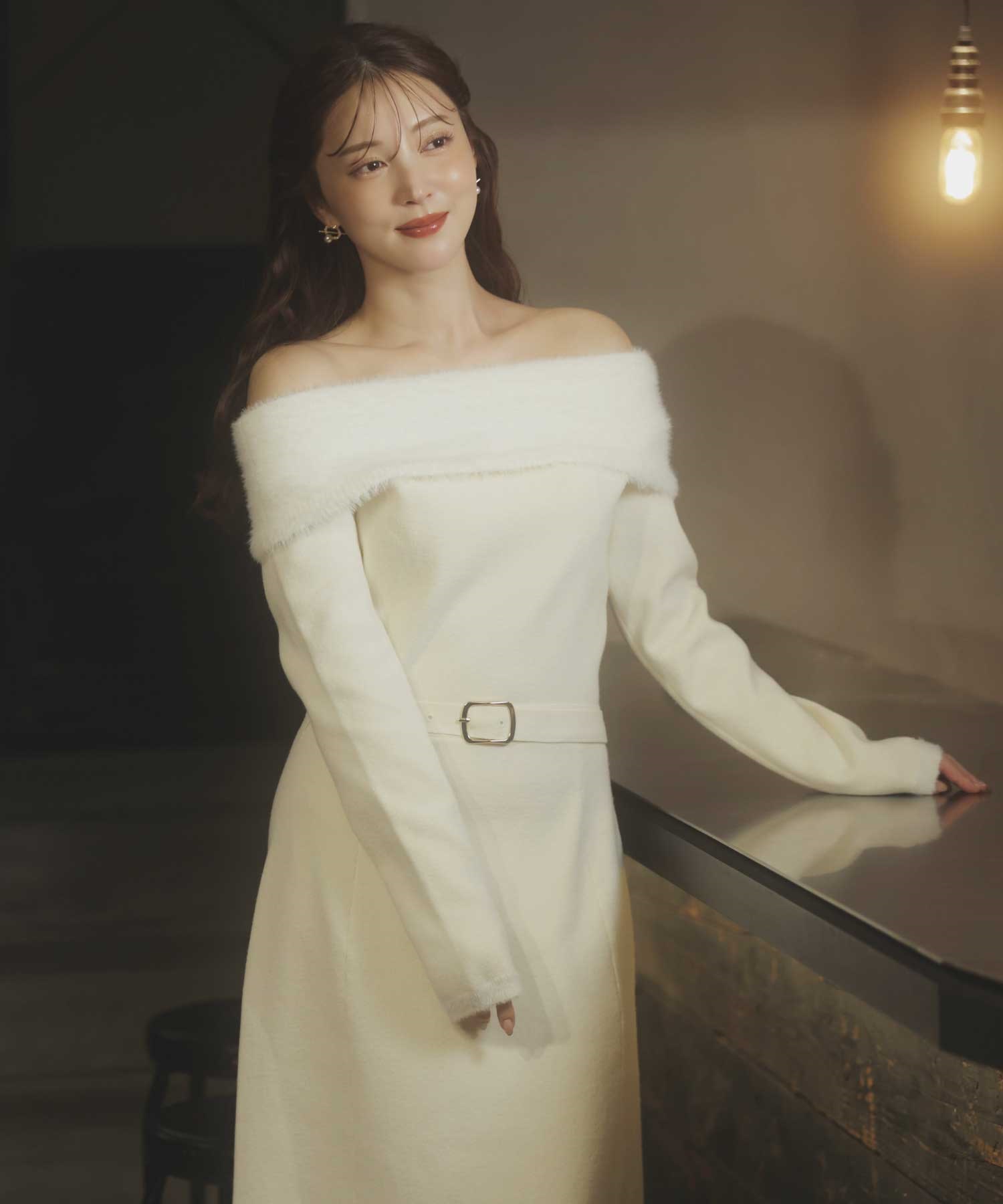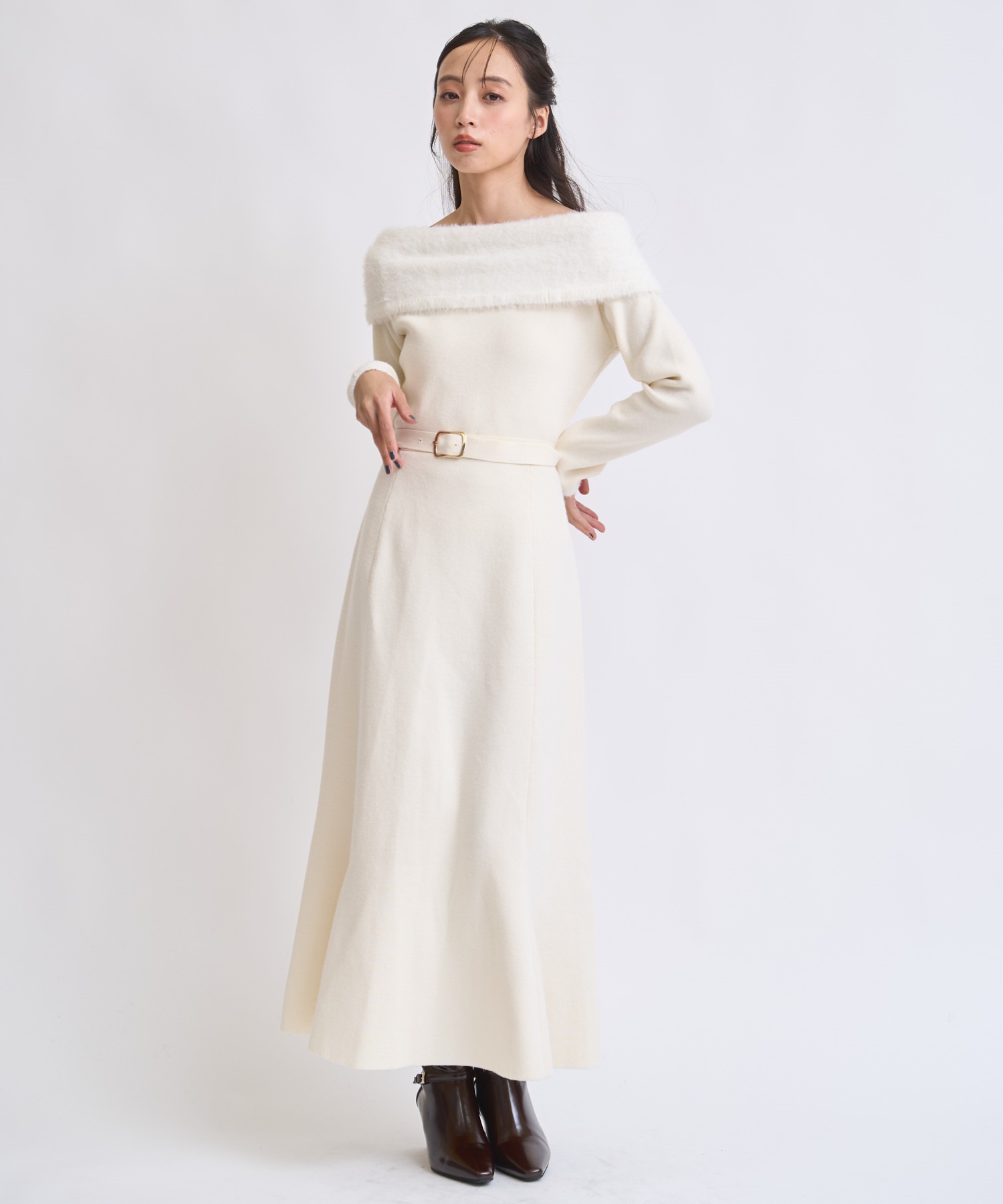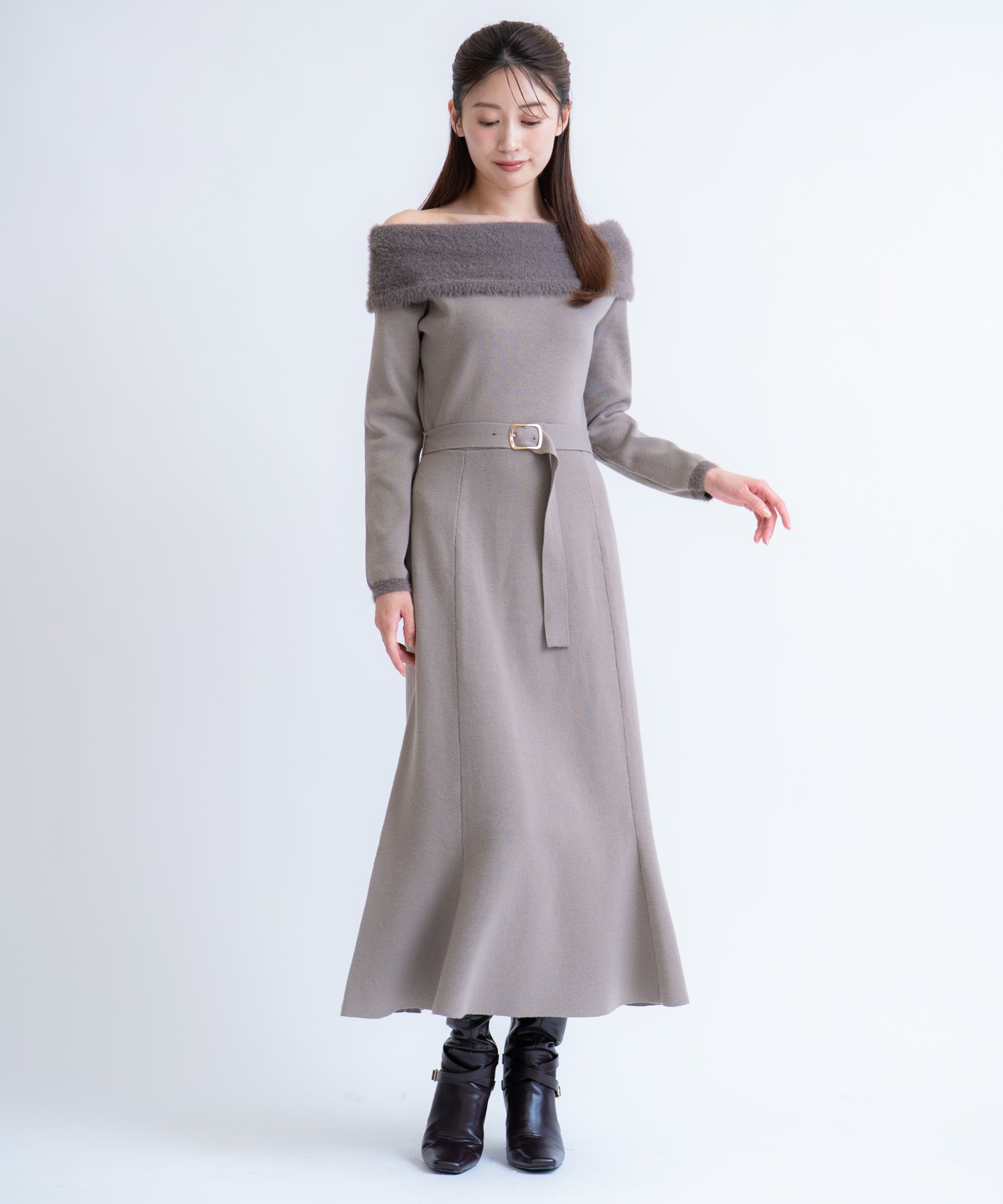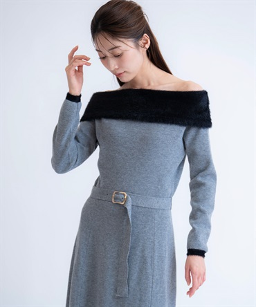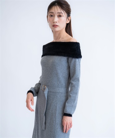 フェザーのオフショルデザインが顔まわりを華やかに見せるニットワンピース。