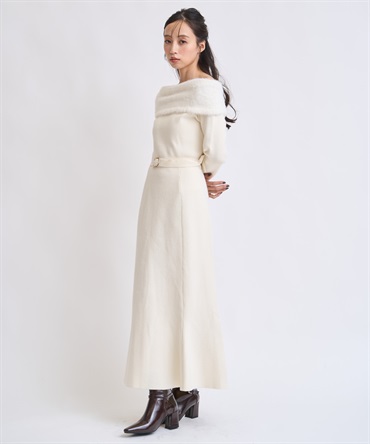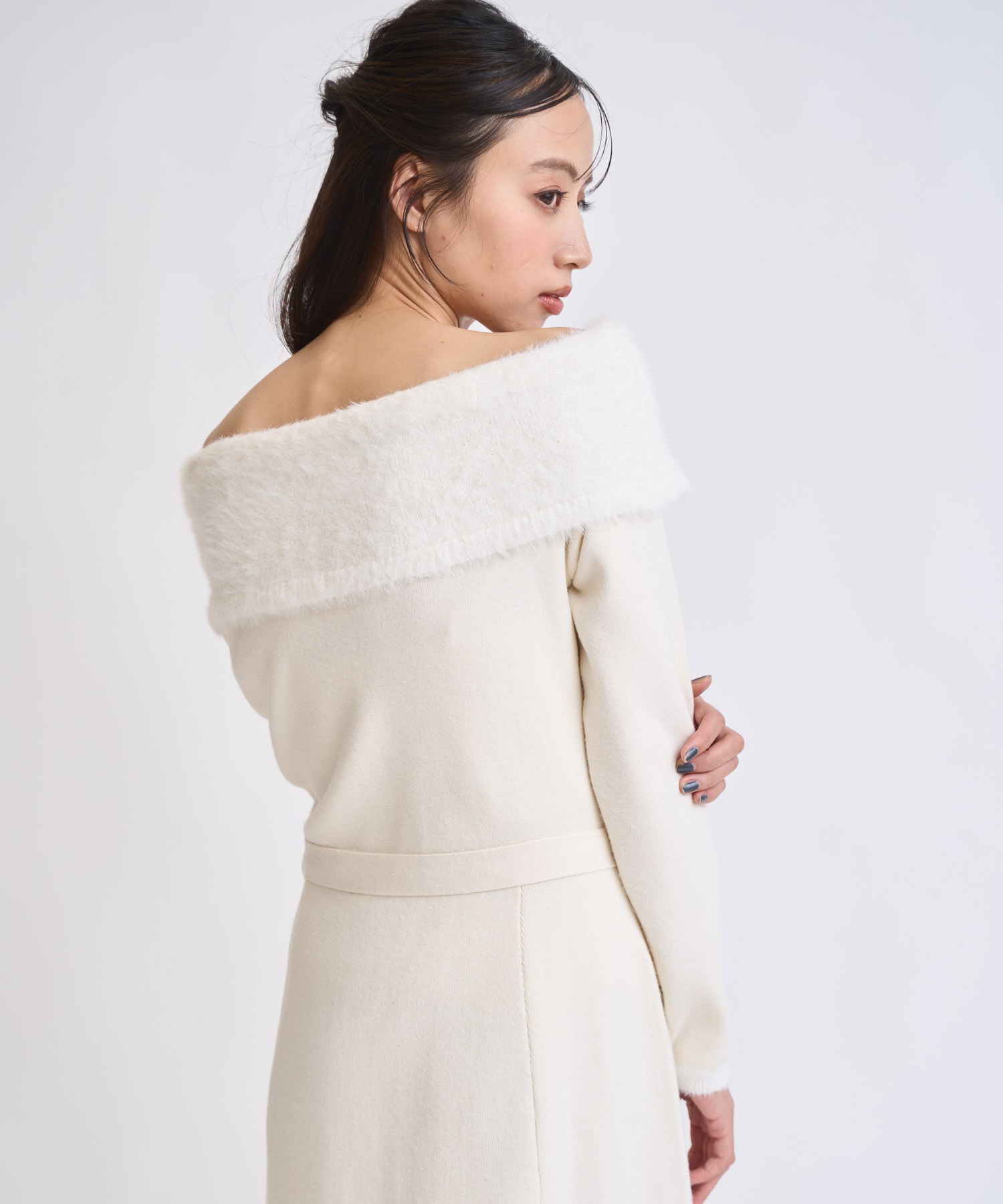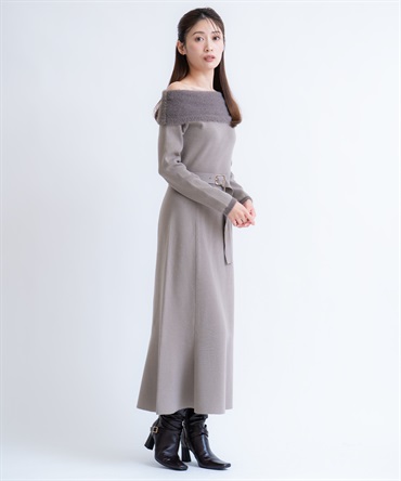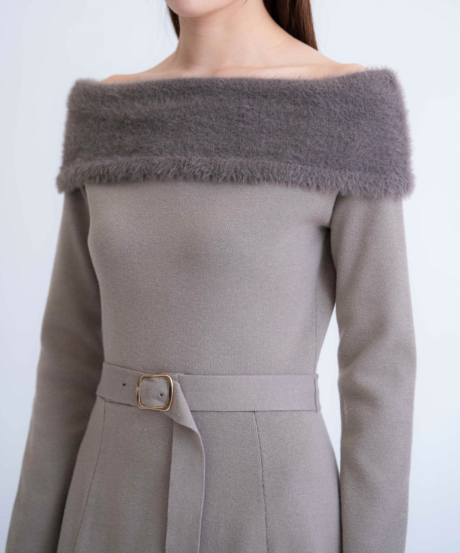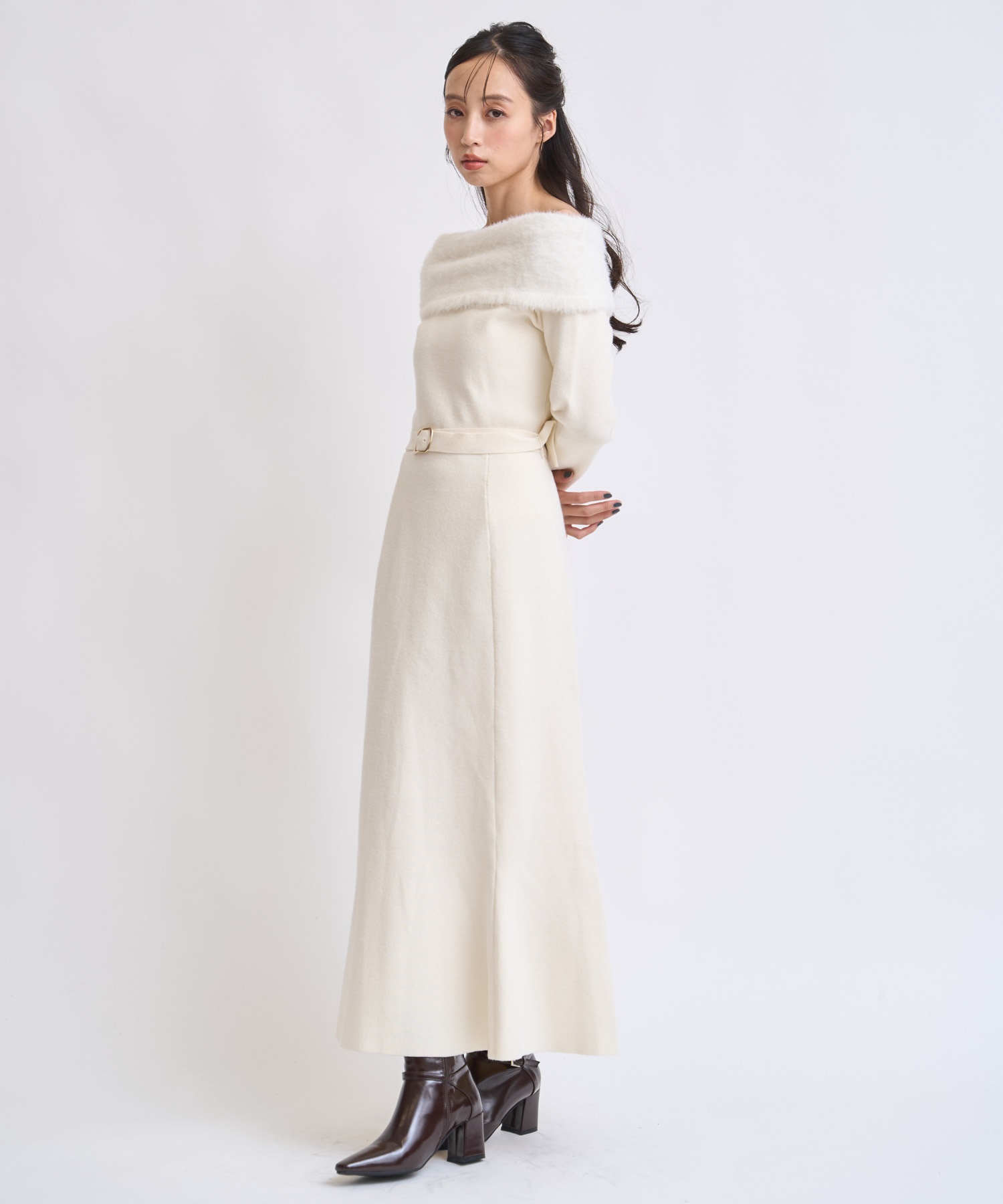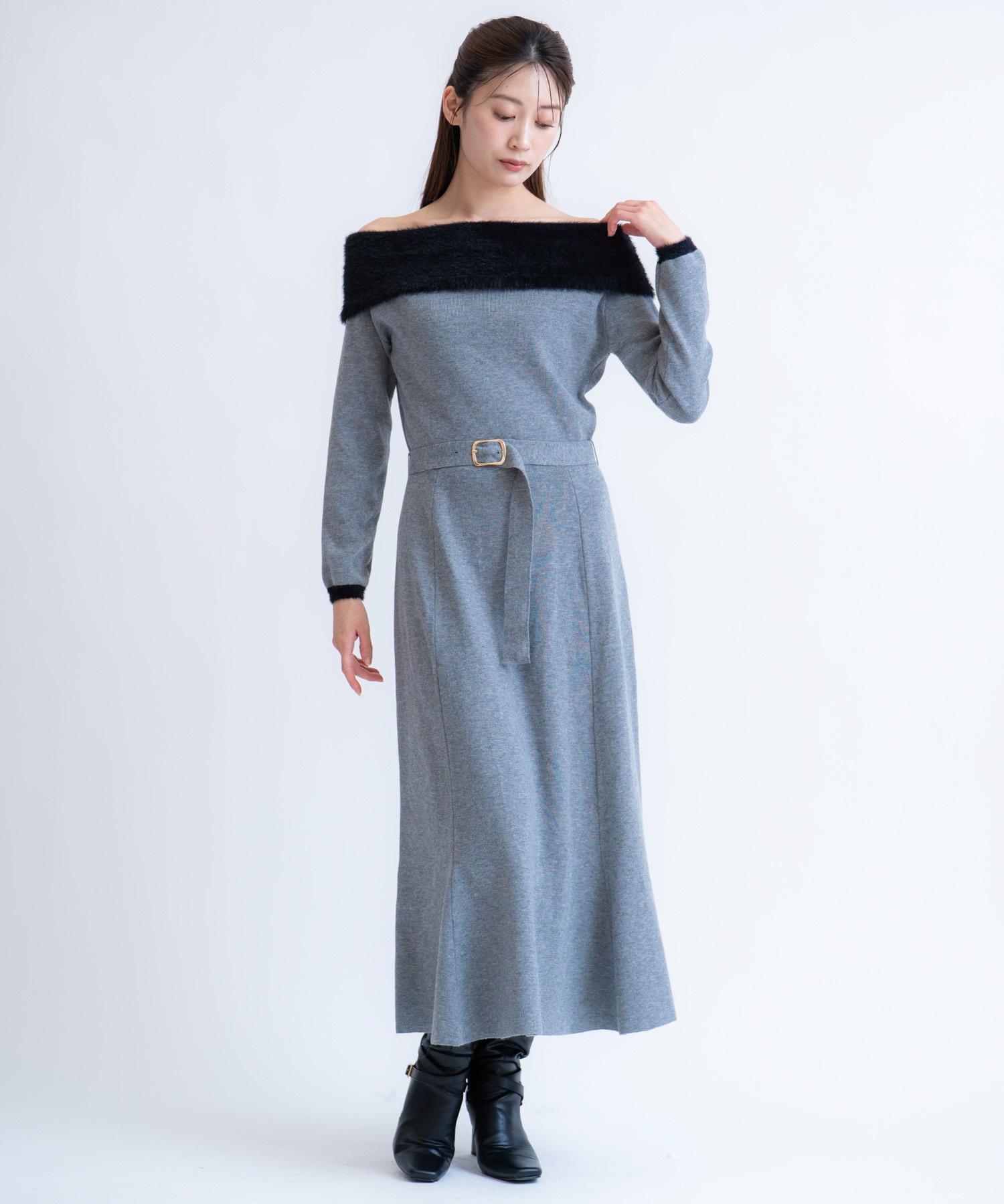 フェザーのオフショルデザインが顔まわりを華やかに見せるニットワンピース。