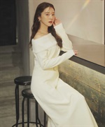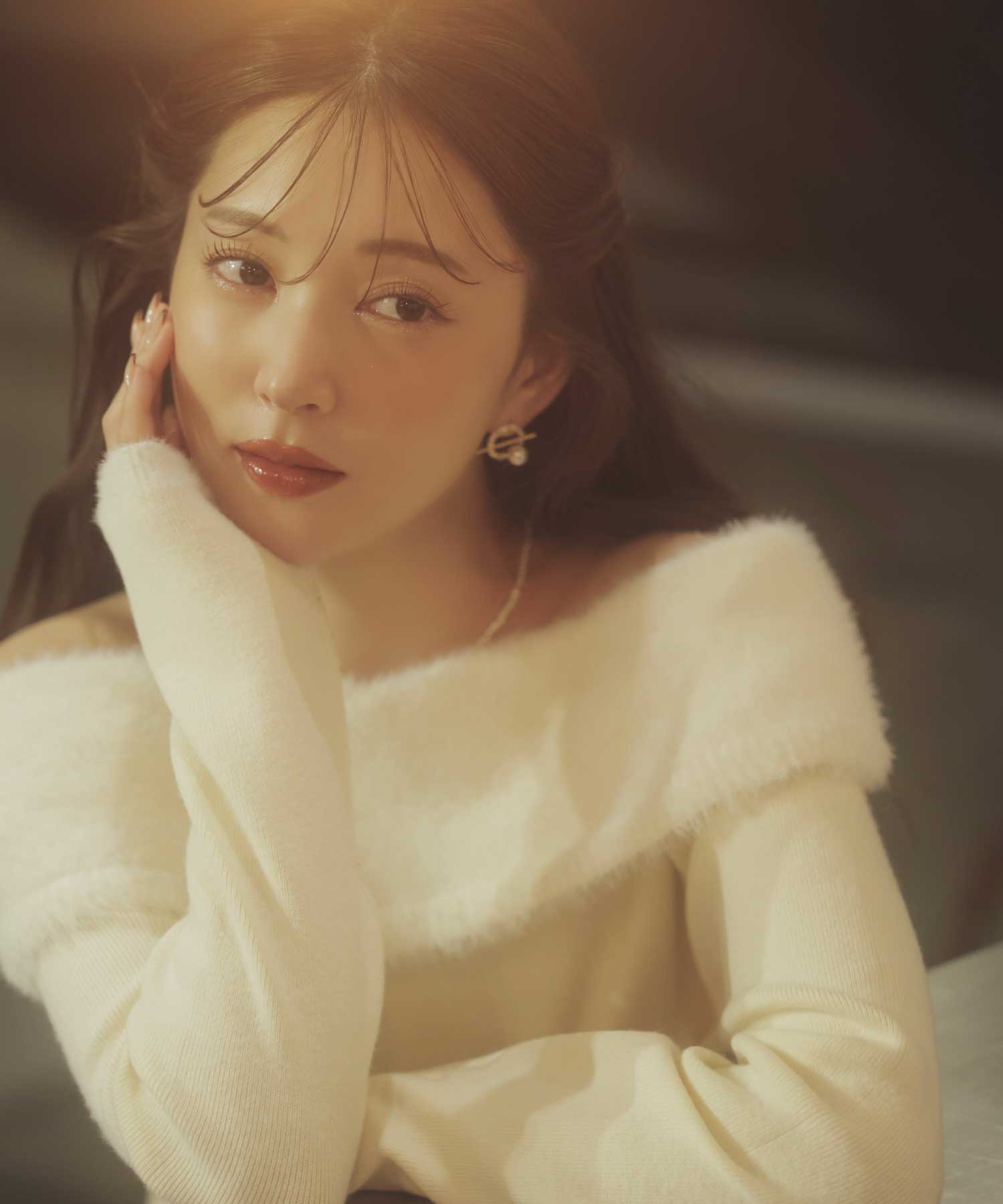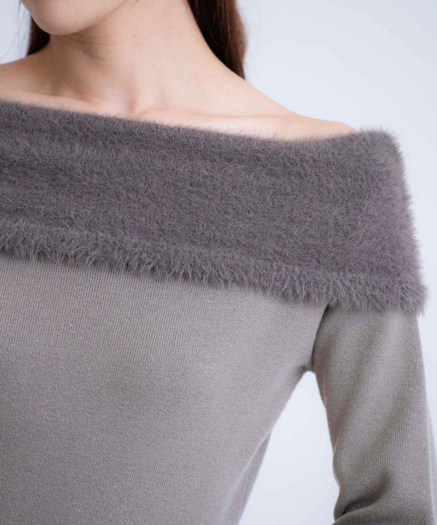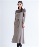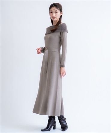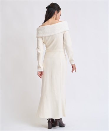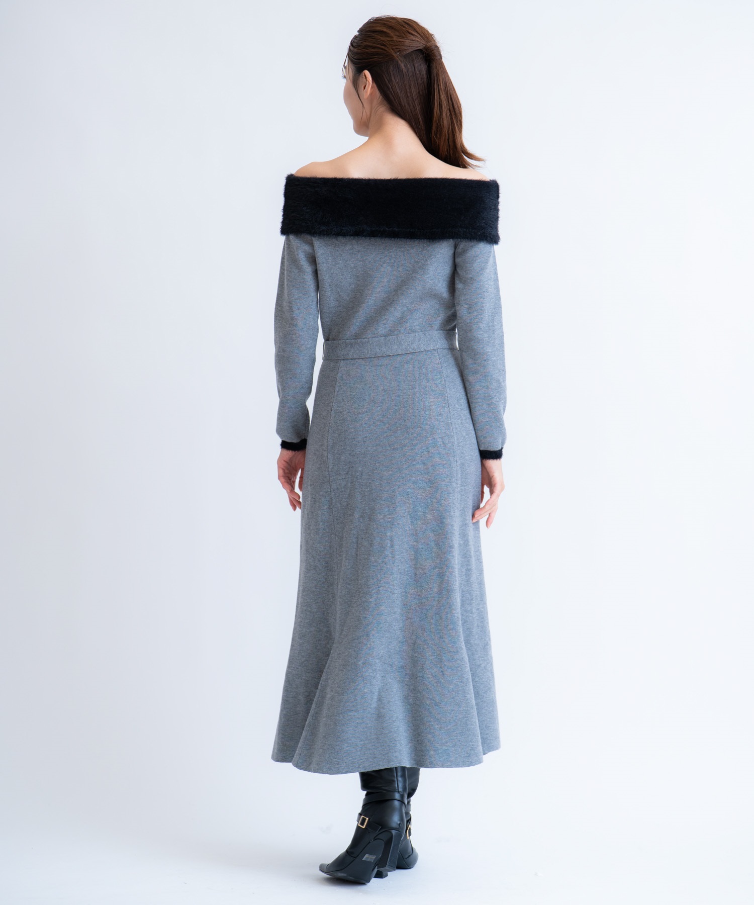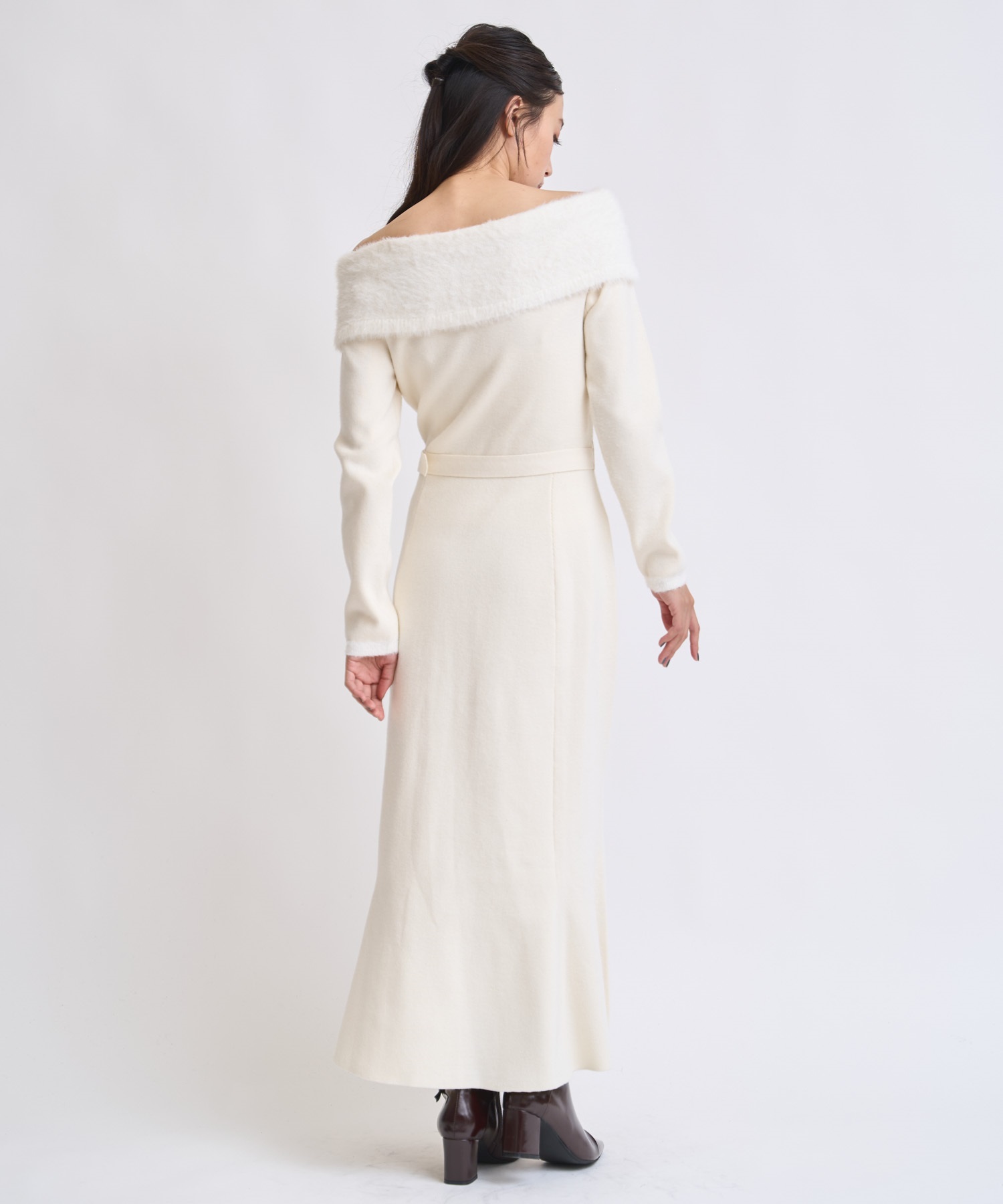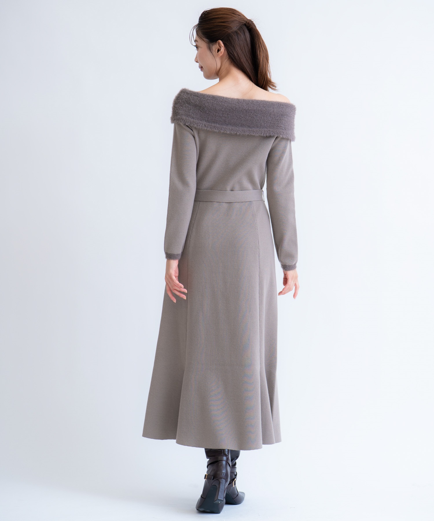 フェザーのオフショルデザインが顔まわりを華やかに見せるニットワンピース。