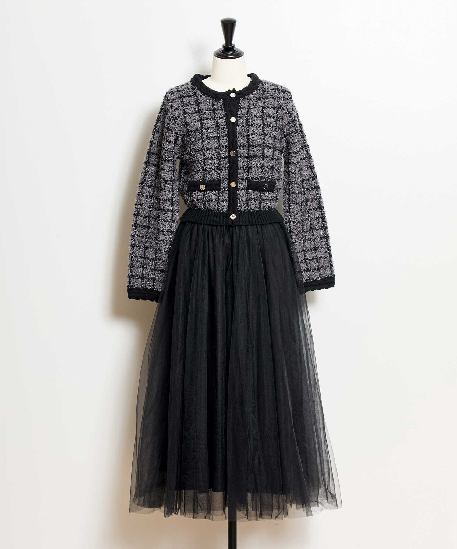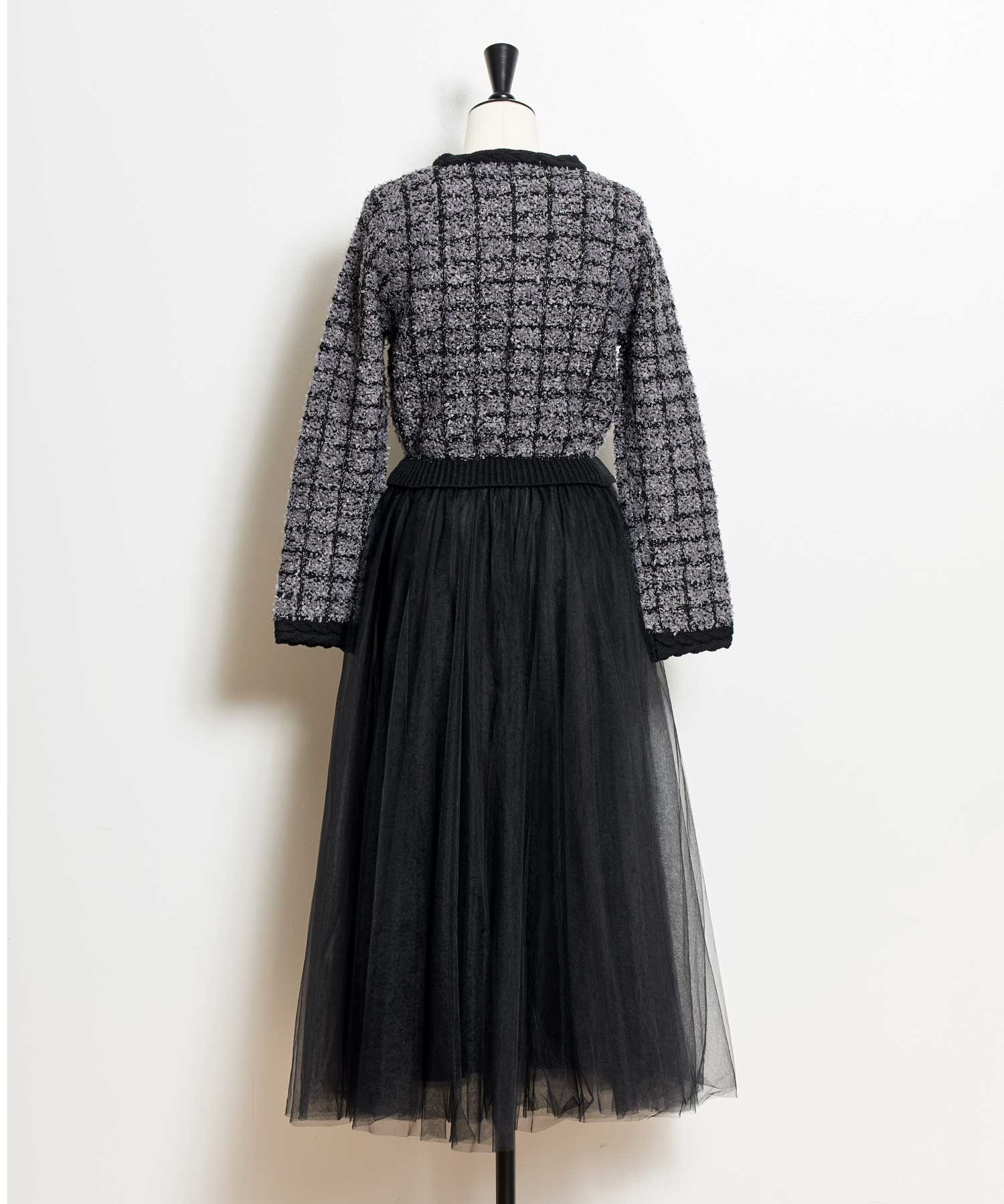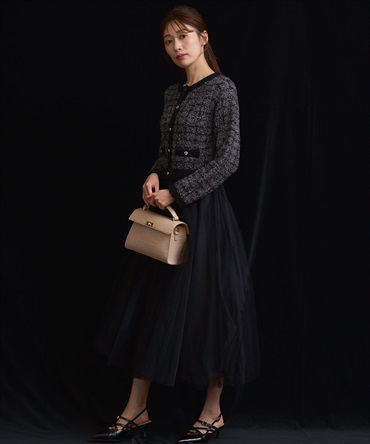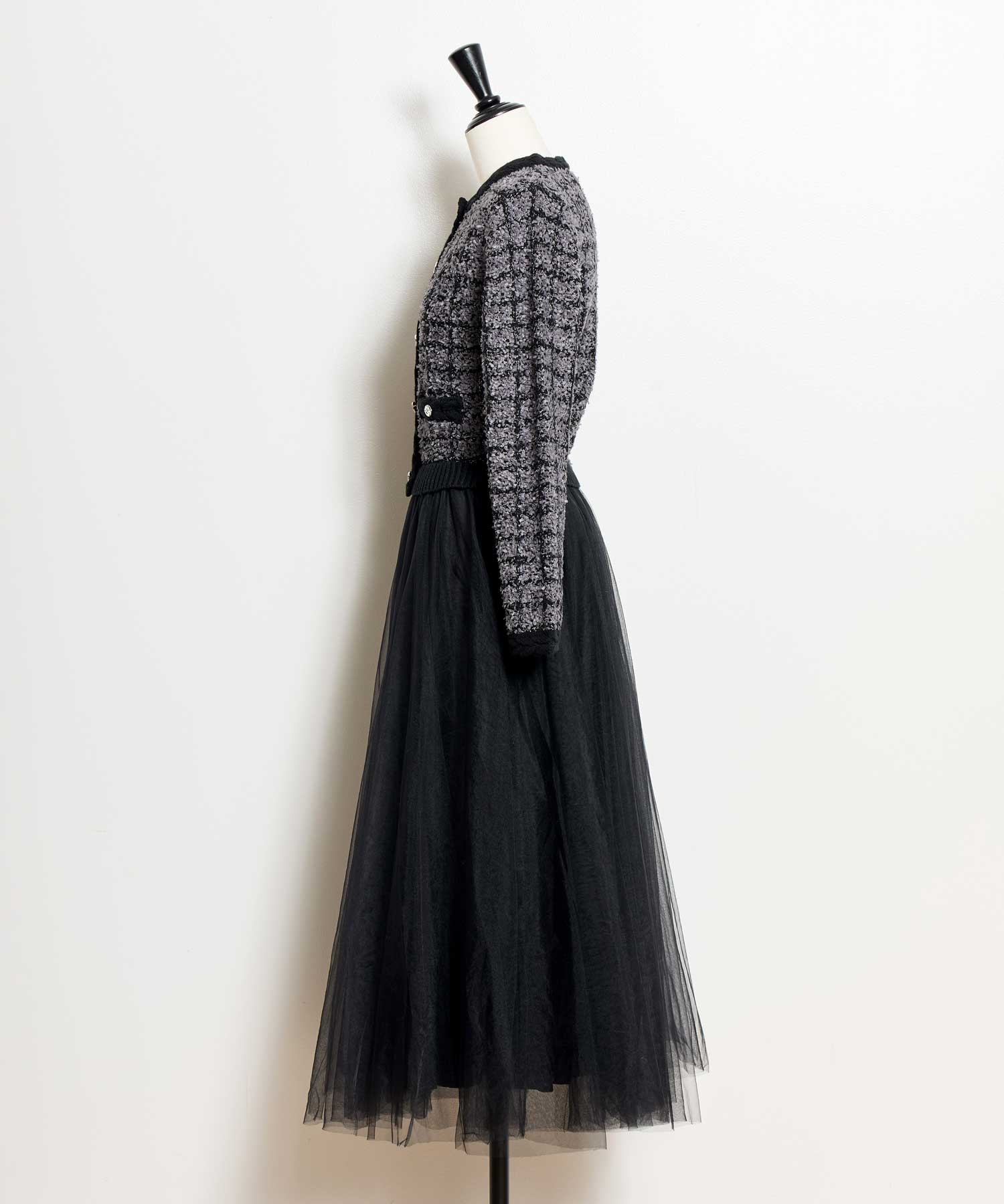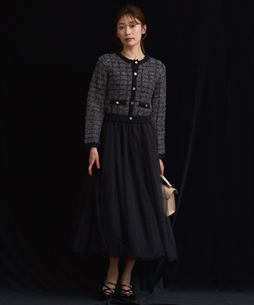 異素材ミックスのツイードニットとチュールスカートをドッキングしたワンピース。
