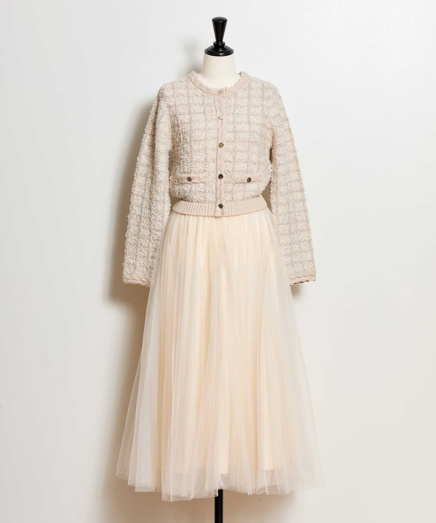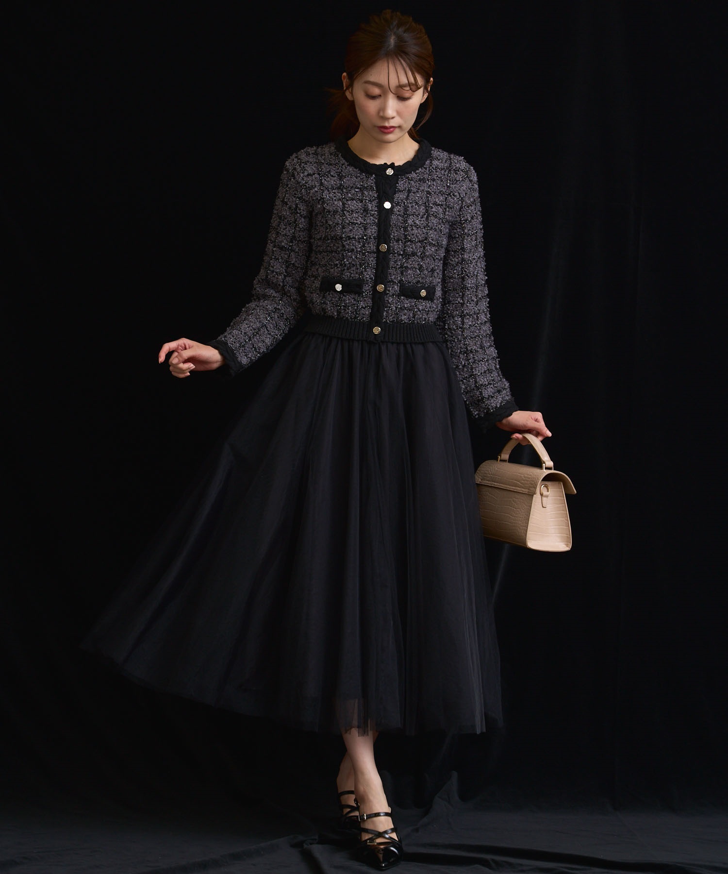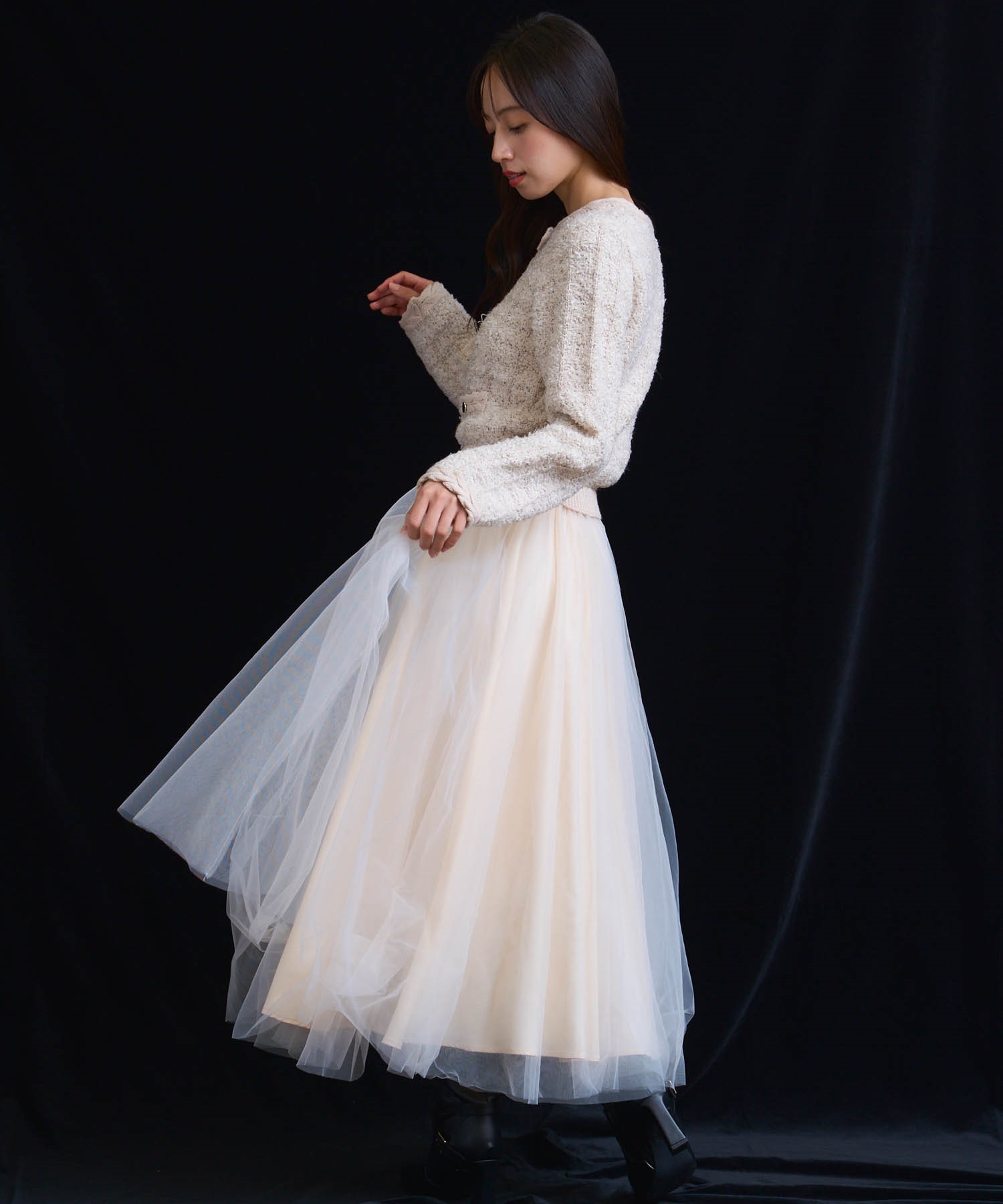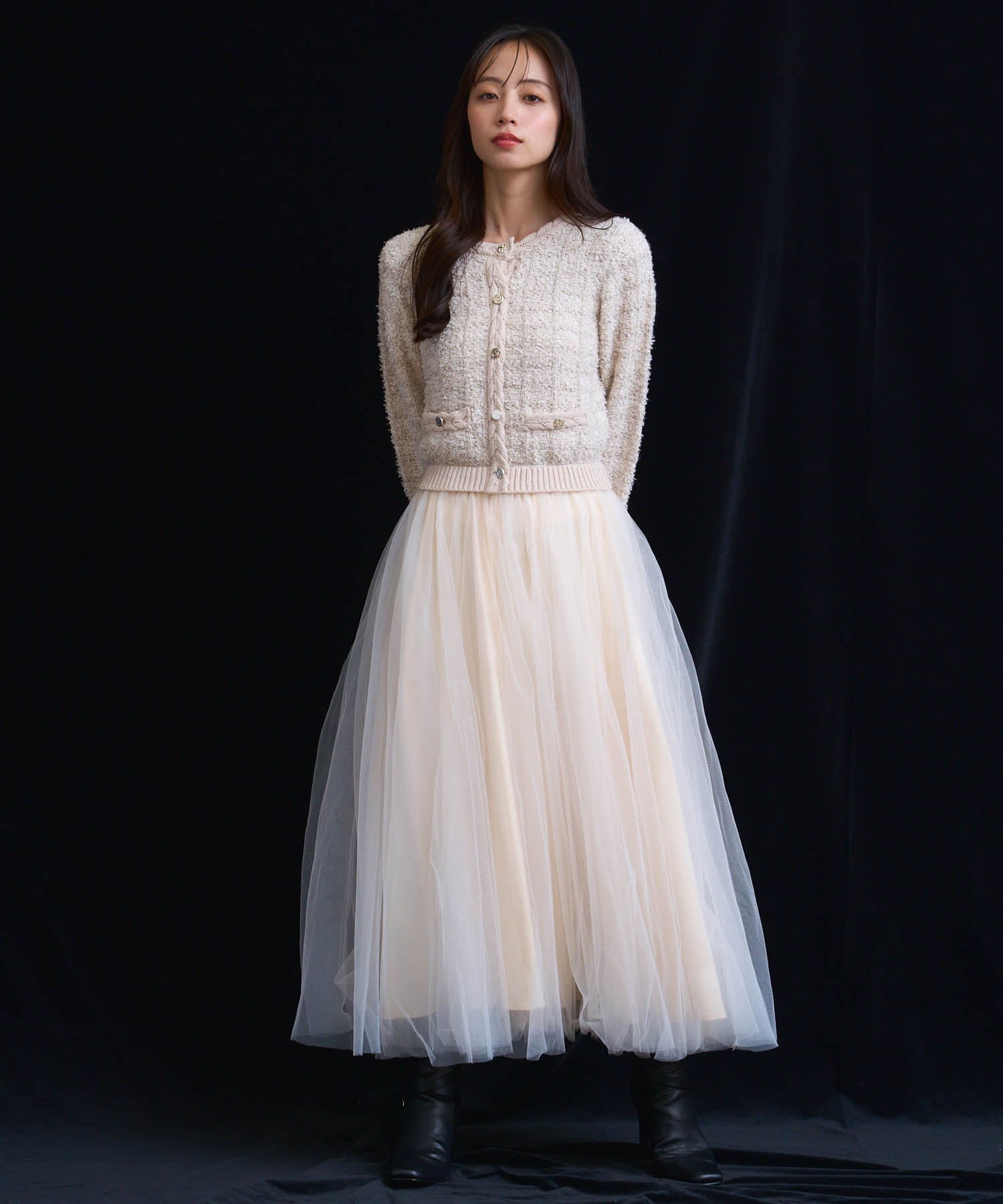 異素材ミックスのツイードニットとチュールスカートをドッキングしたワンピース。