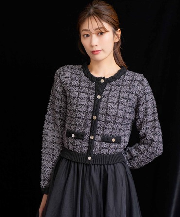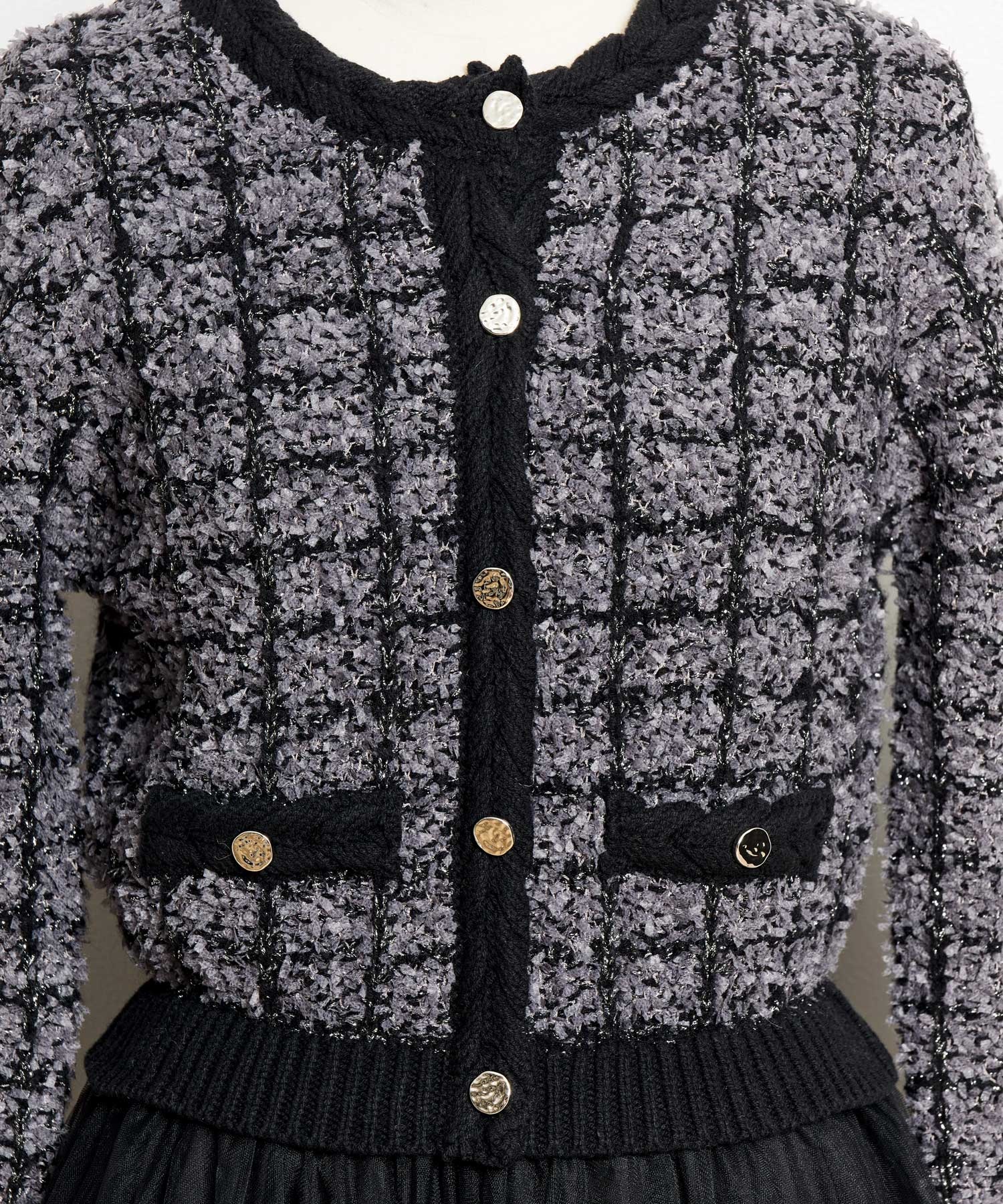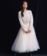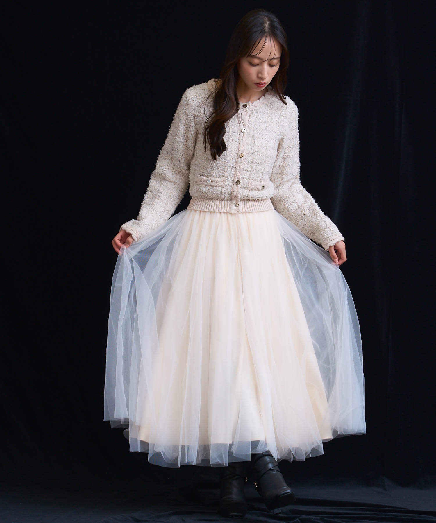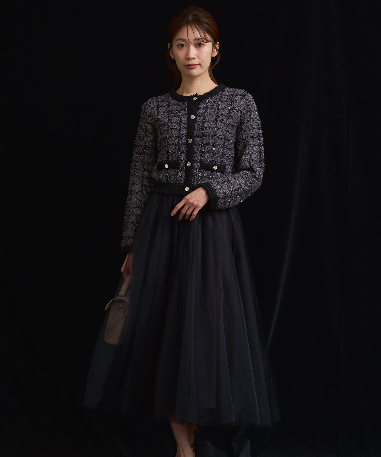 異素材ミックスのツイードニットとチュールスカートをドッキングしたワンピース。