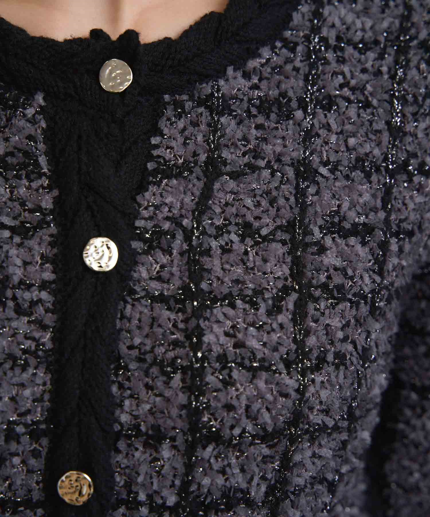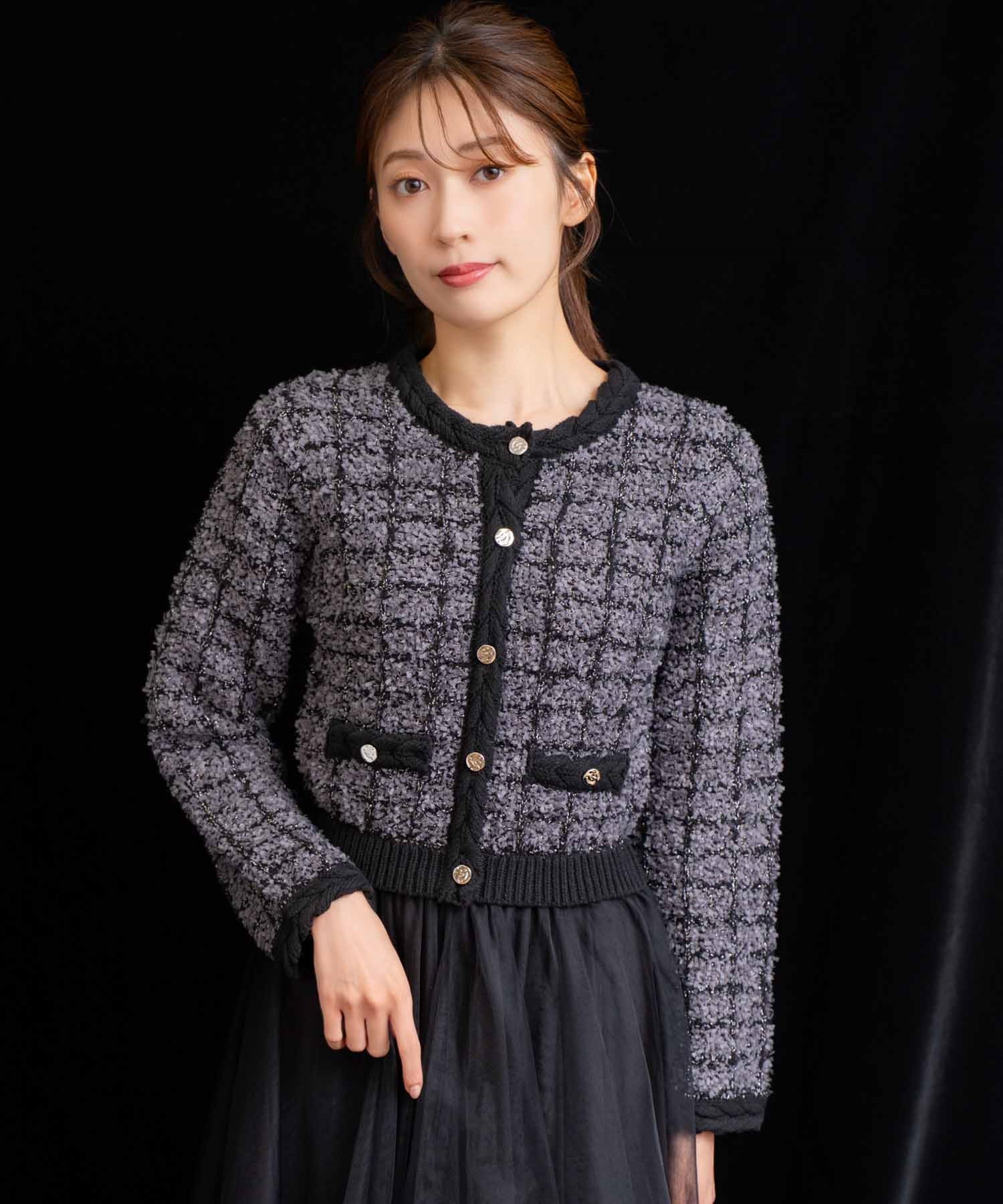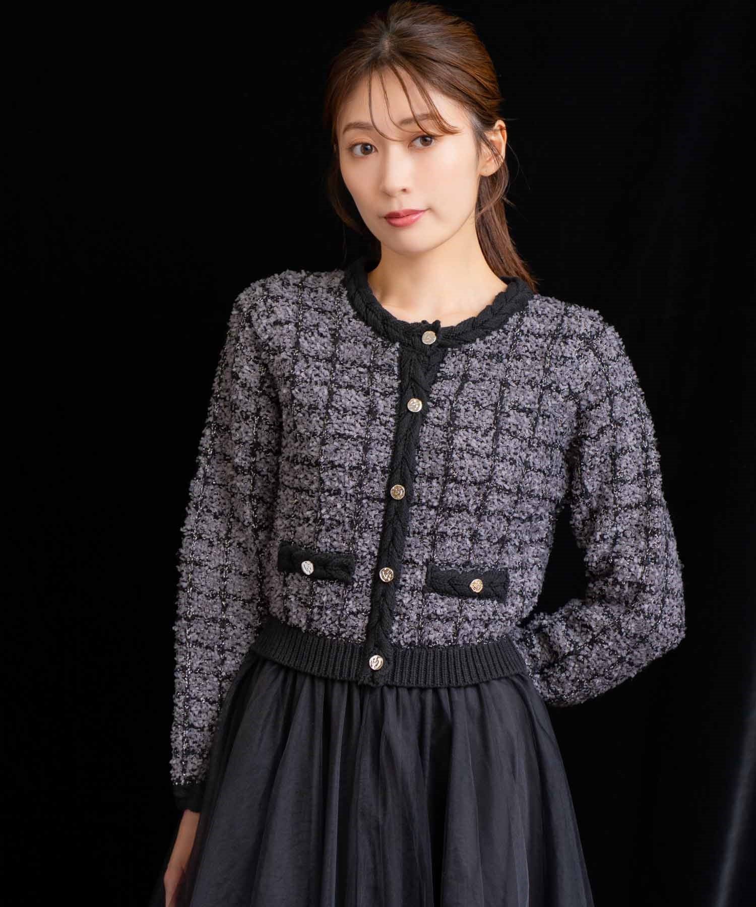 【おすすめポイント】:トップス部分はラメとジャガード糸で華やかさ抜群。格子柄もあいまって目を引くデザインです。セパレート風のワンピースだから、コーディネートがばっちり決まるのに着やすく、いいとこ取りの1枚です。