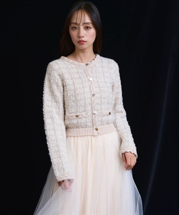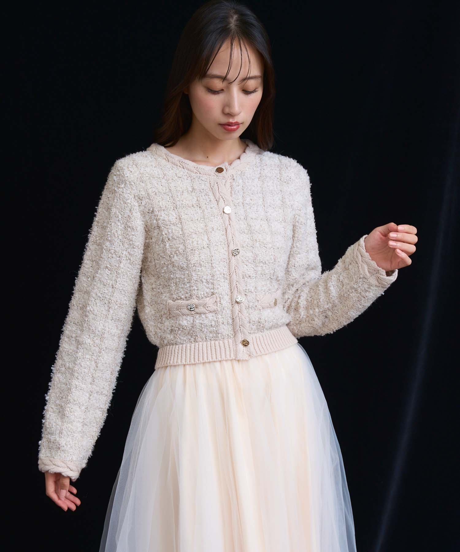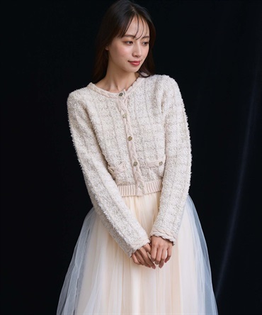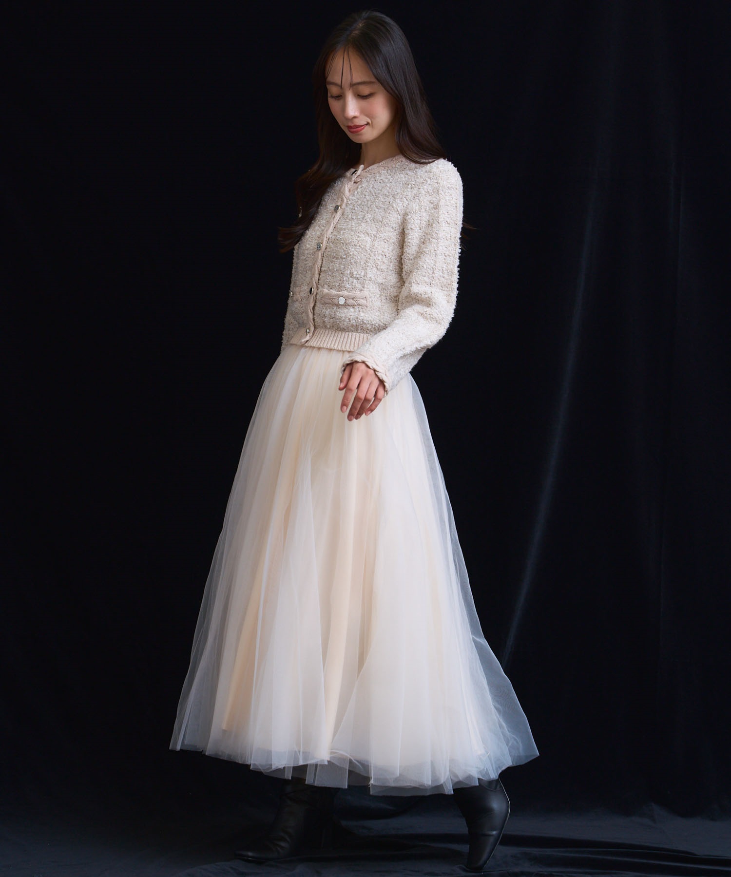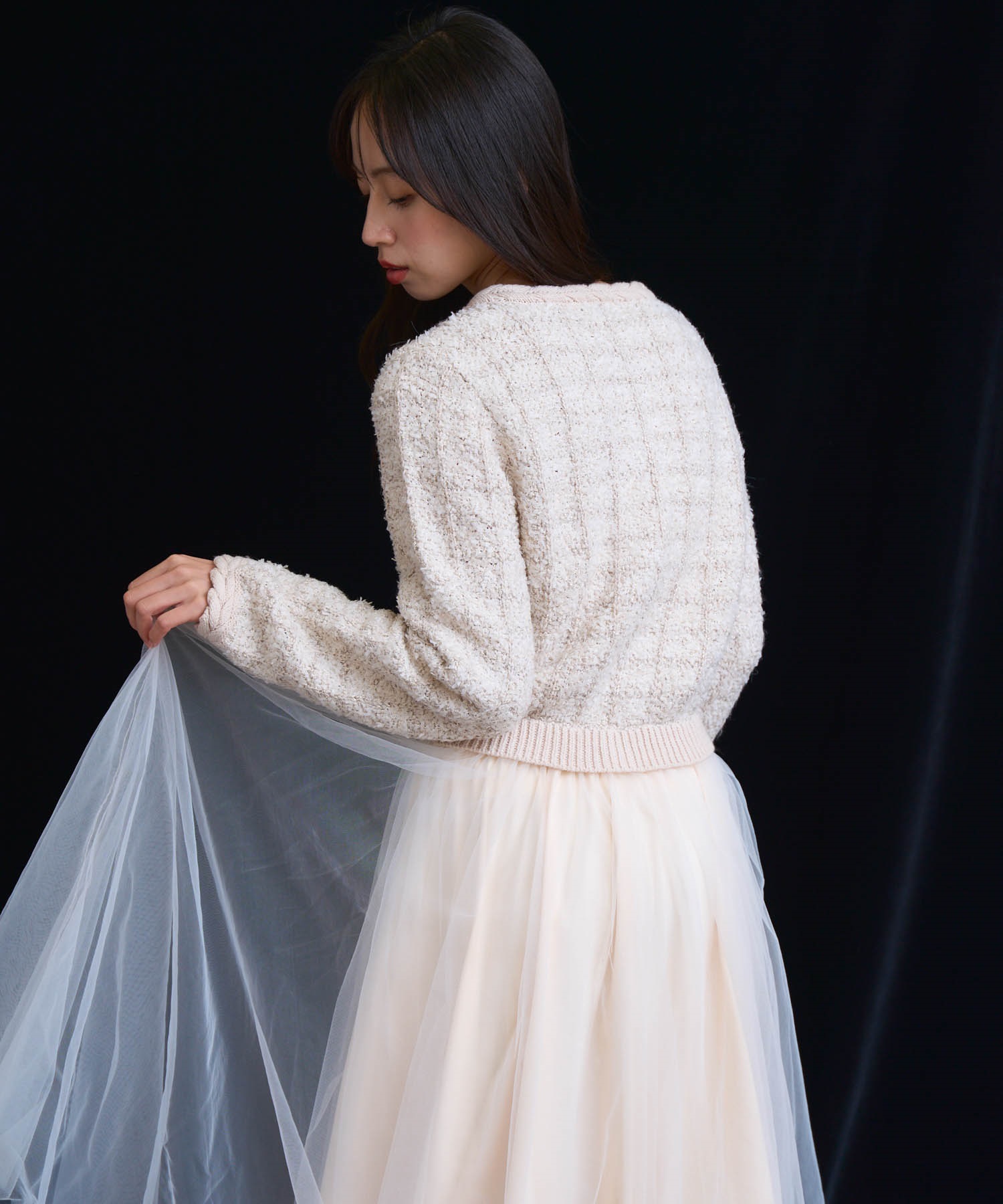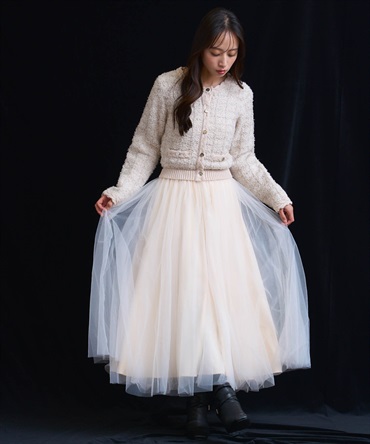 複数の糸を編み込んだ表情豊かなトップスと、たっぷりのチュールが魅力です。