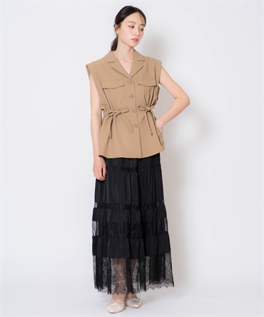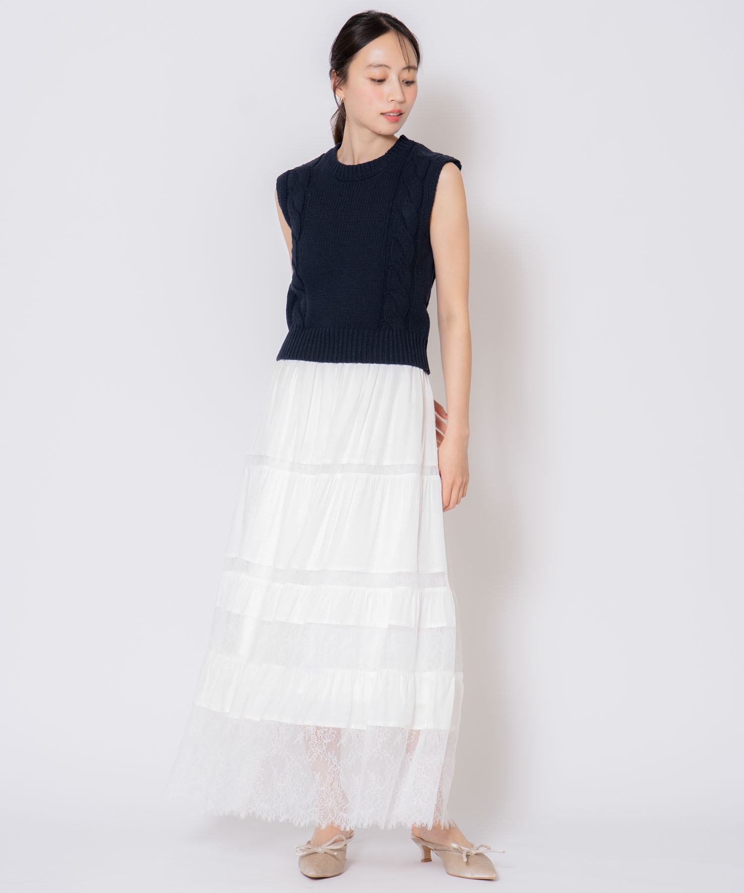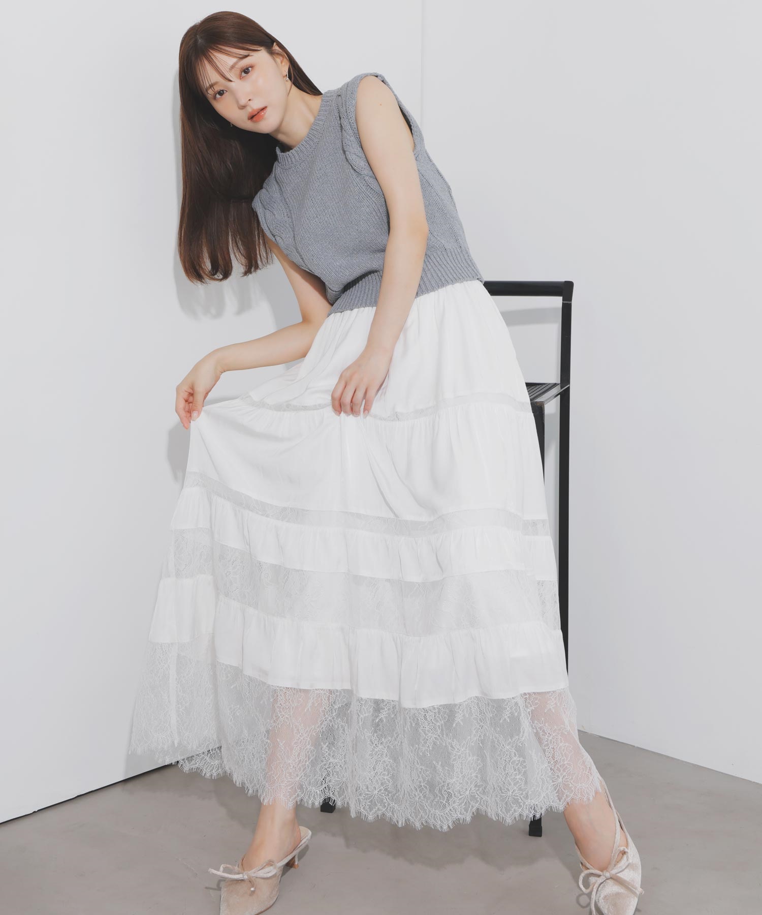 7月に販売した「レース切り替えスカート」をより秋らしくアップデートして、繊細レースを切り替えたスカート。