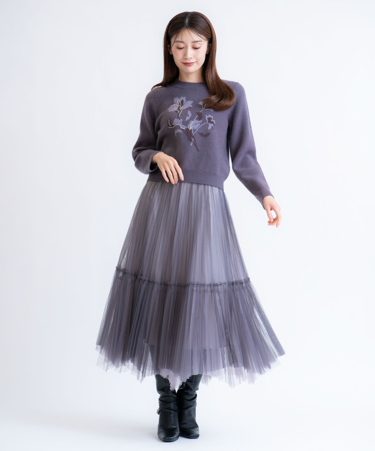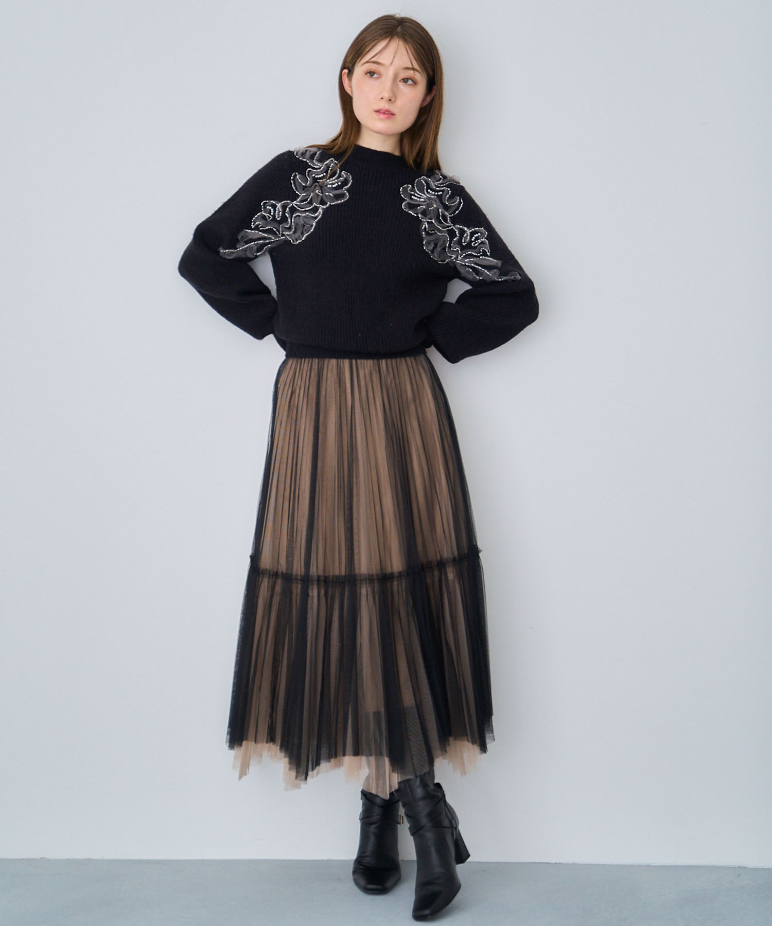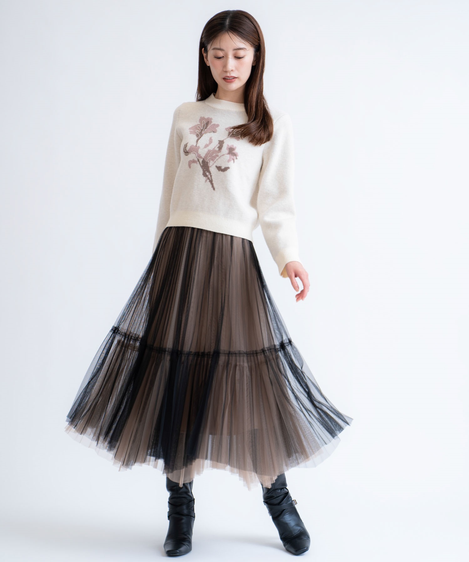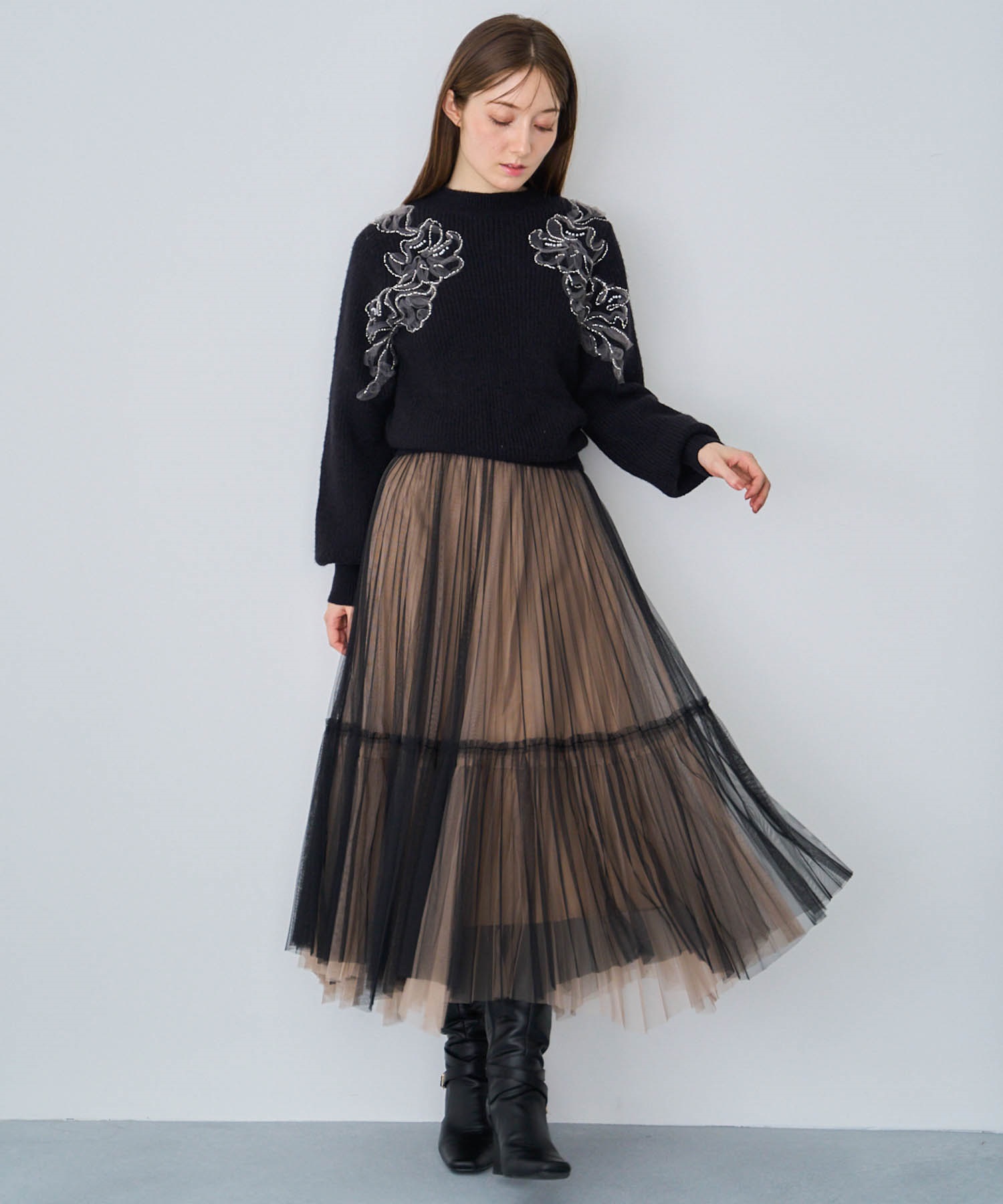 透け感のあるチュールが奥行きを生み、コーデに品のある華やかさをプラスします。