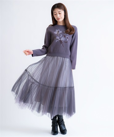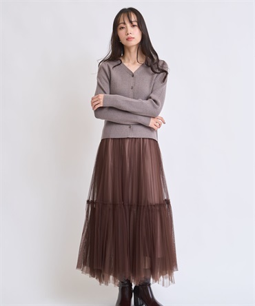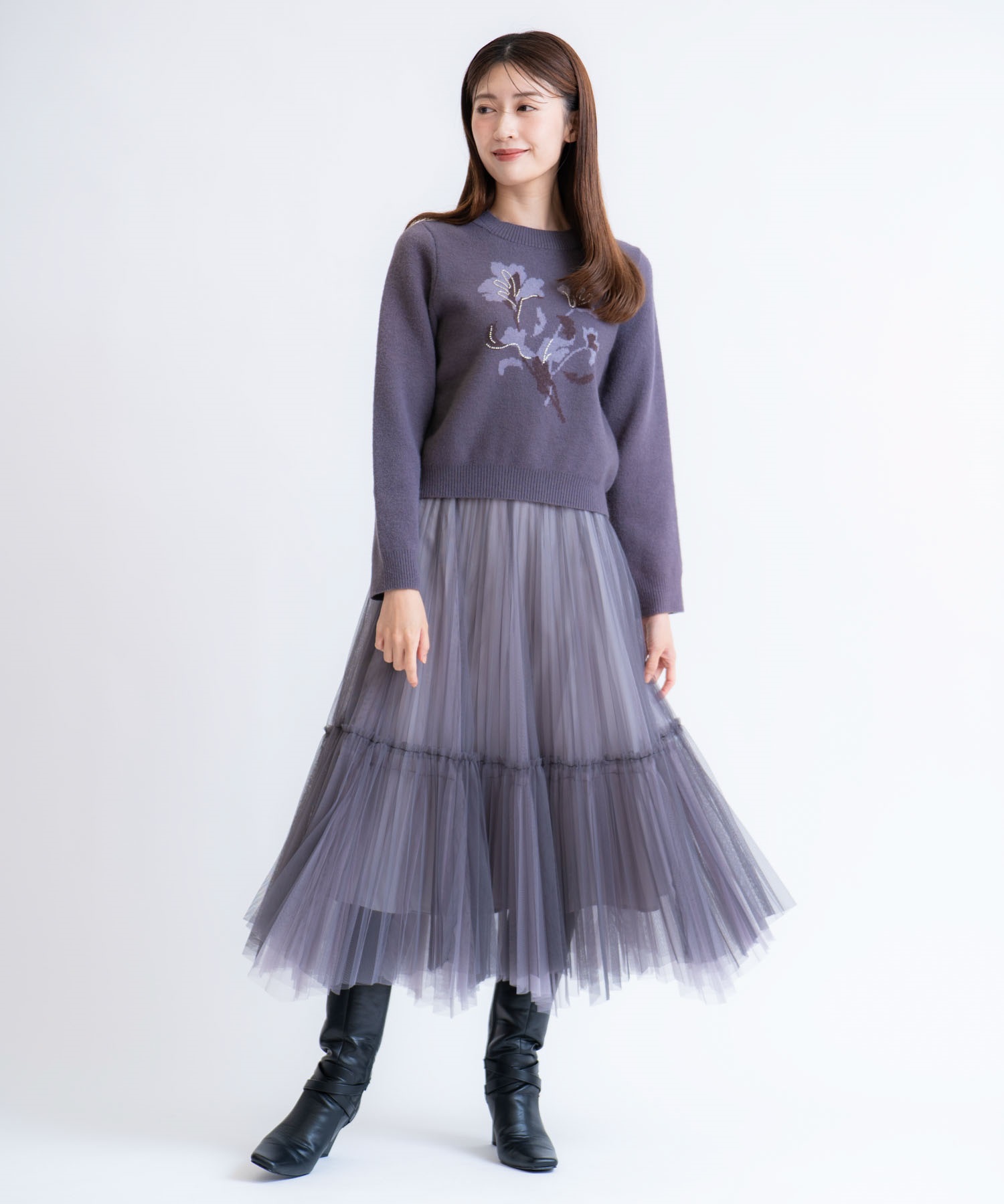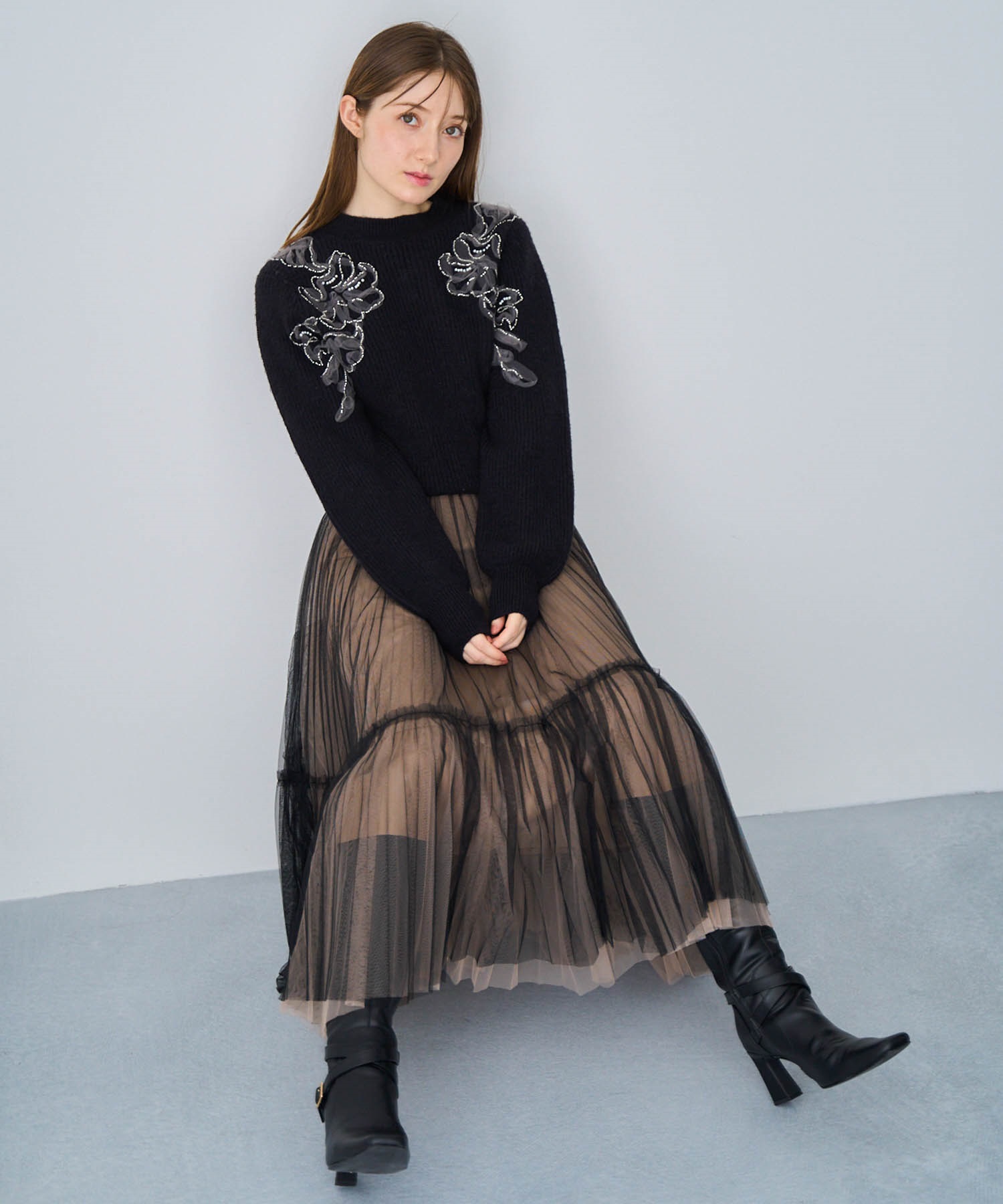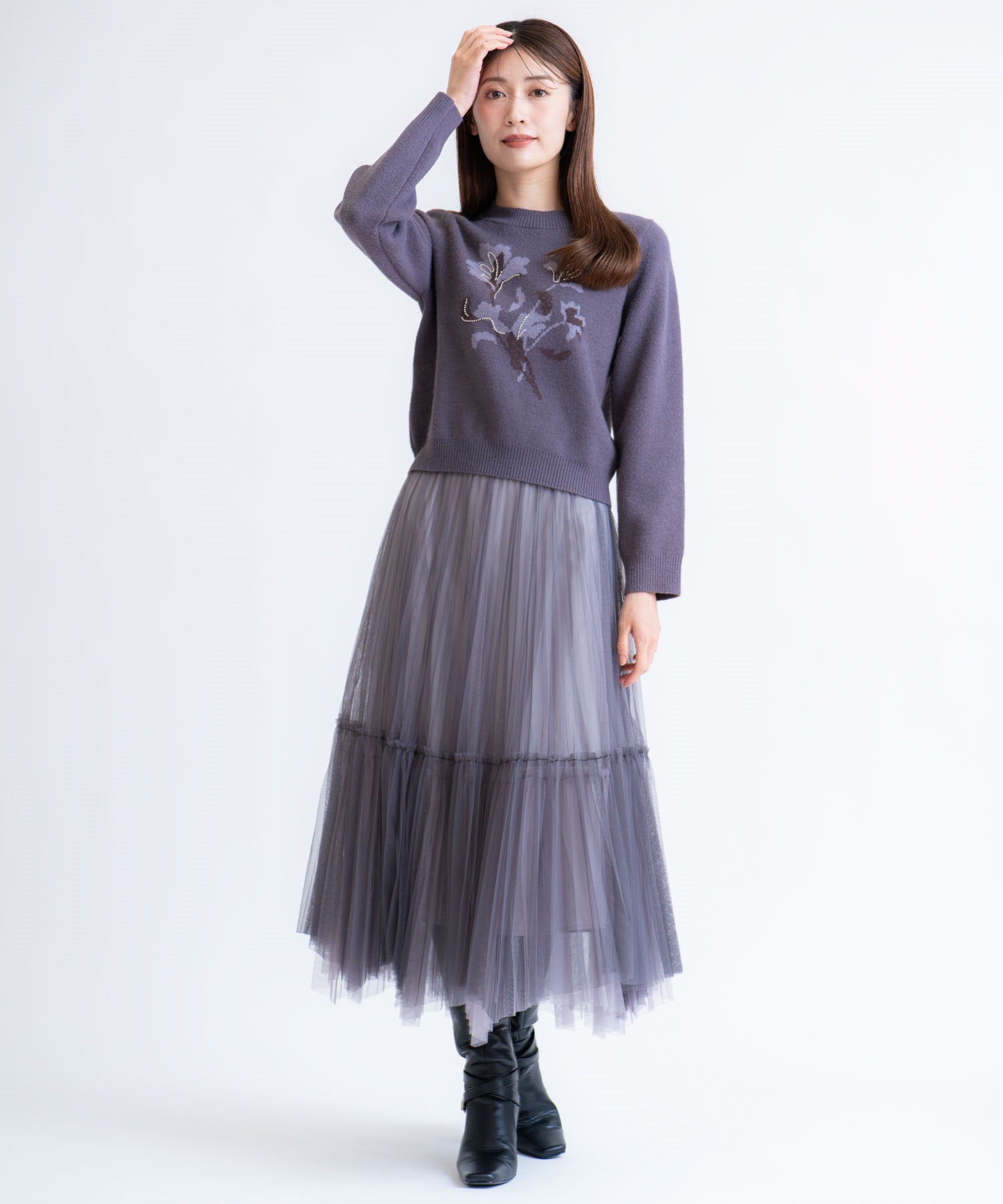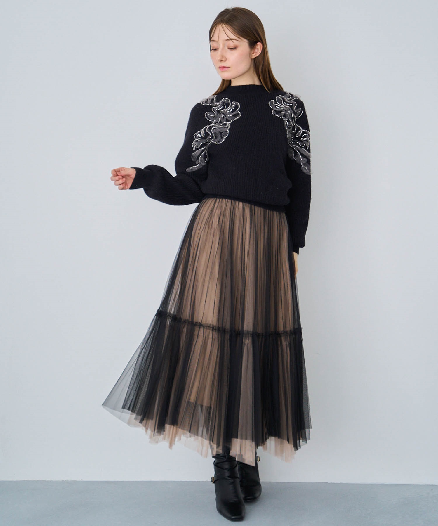 透け感のあるチュールが奥行きを生み、コーデに品のある華やかさをプラスします。