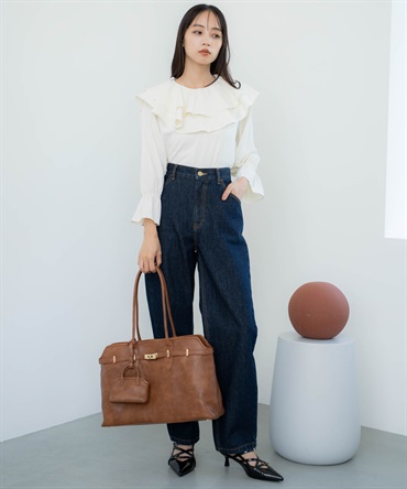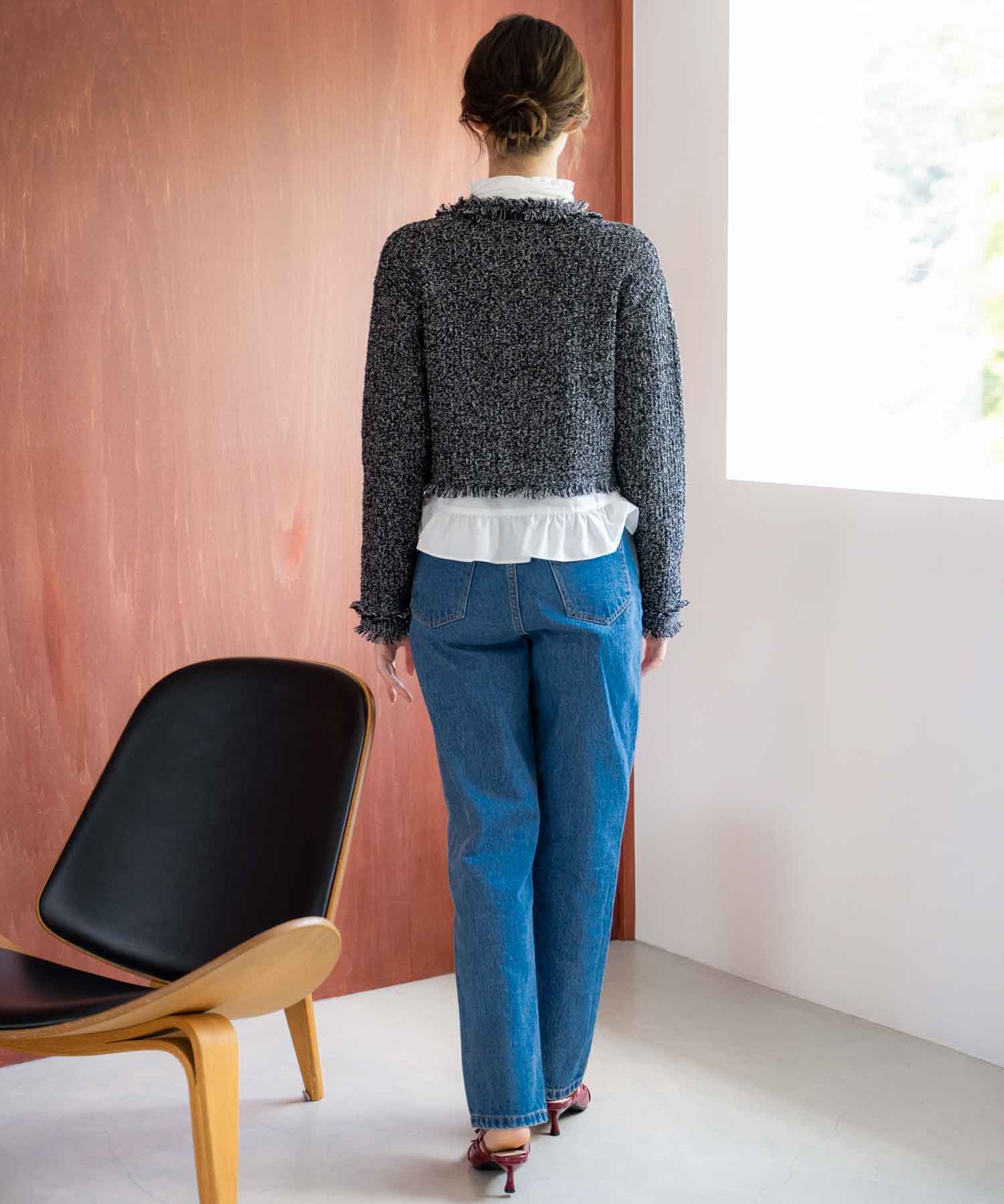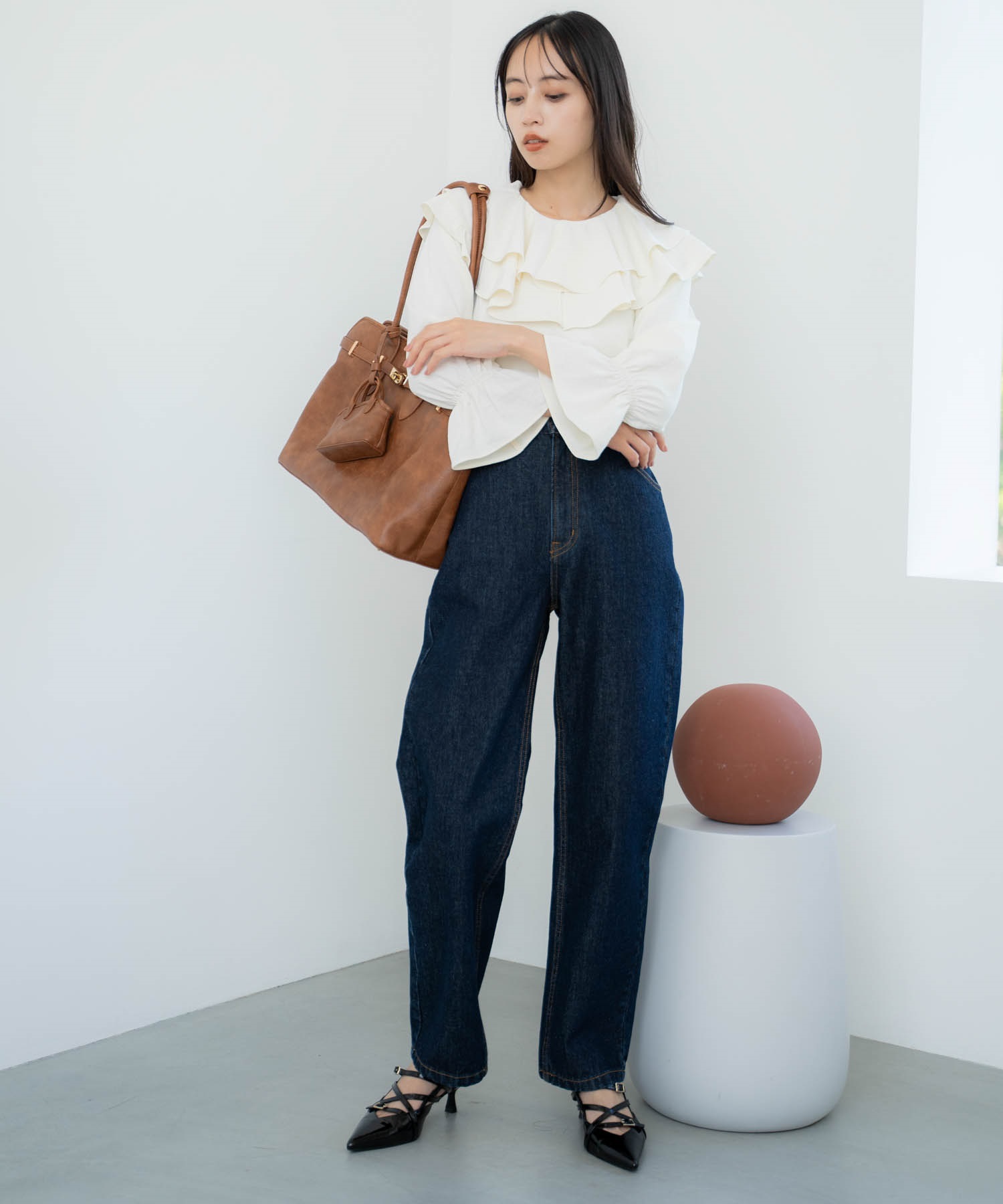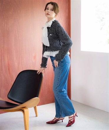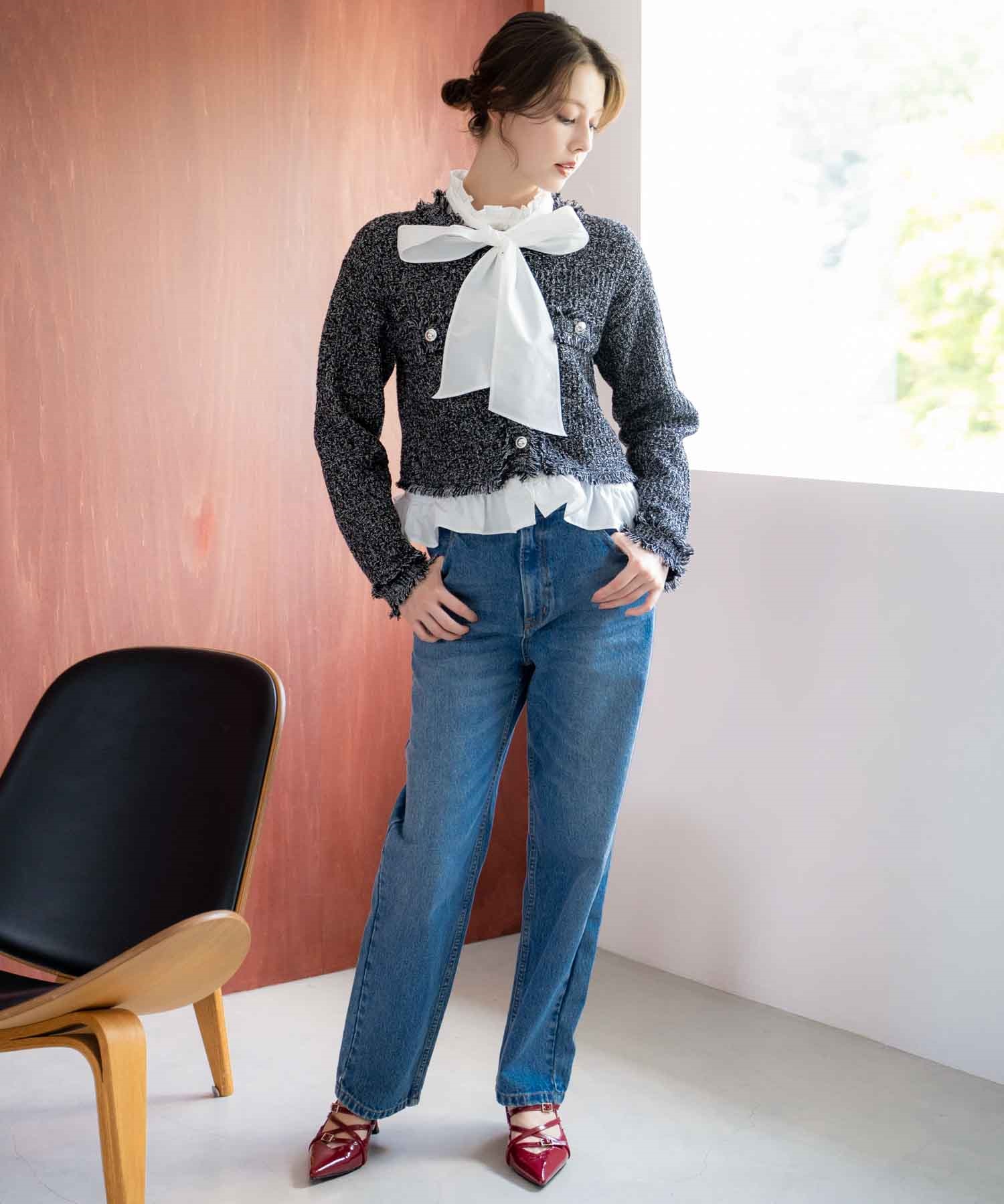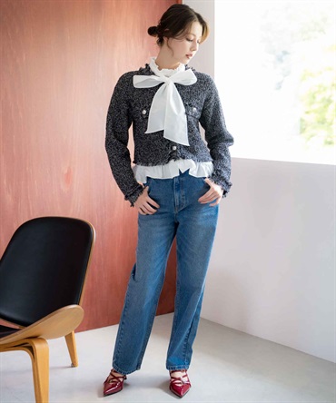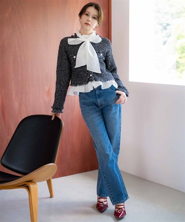 フリルブラウスやツイードジャケットとのコーディネートがおすすめです。