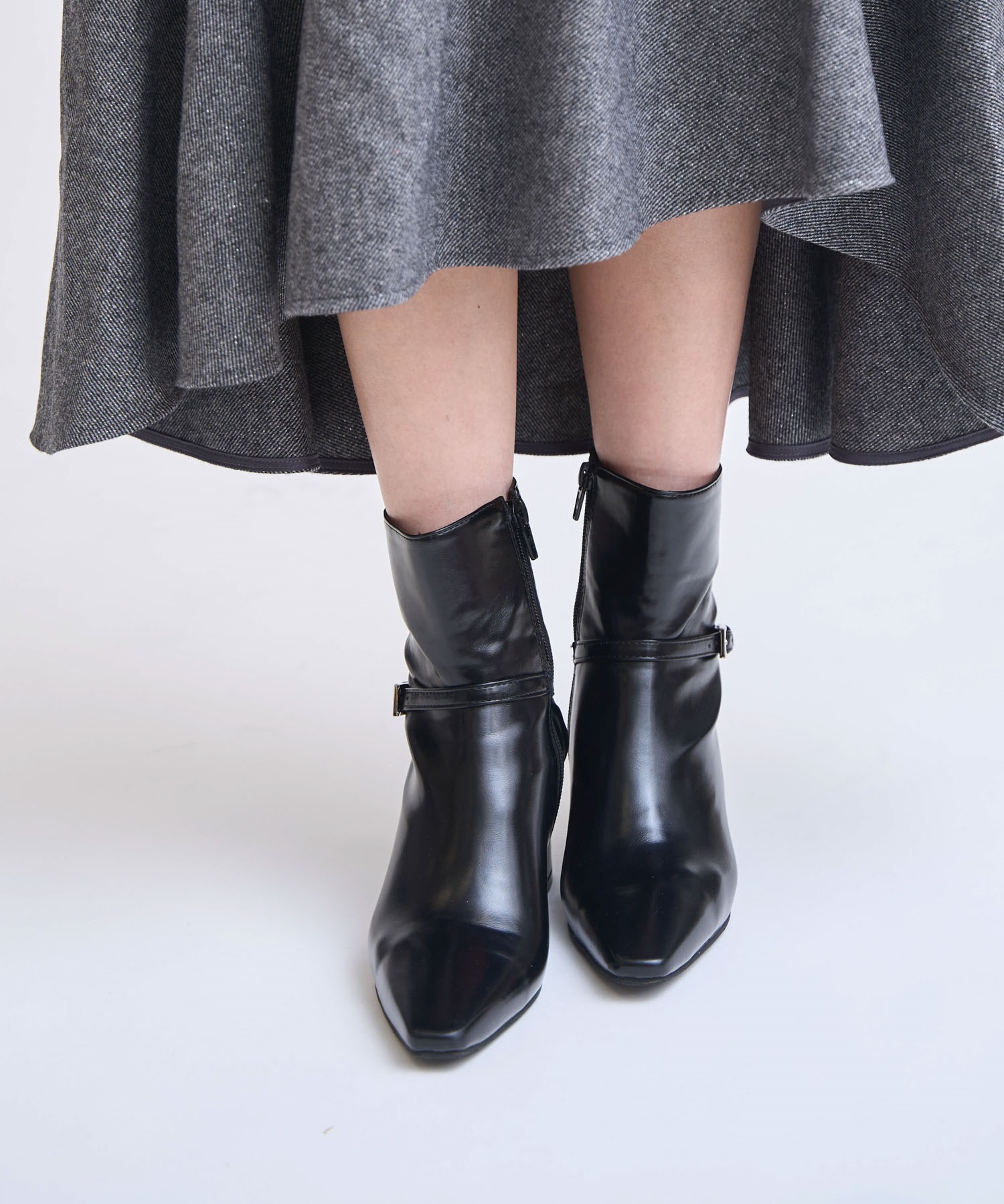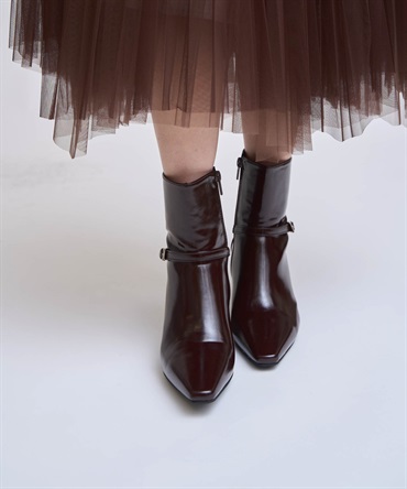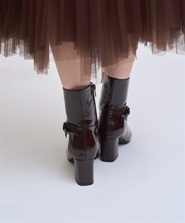 上品なツヤ感のある素材に、アクセントのベルトデザインをあしらったショートブーツ。