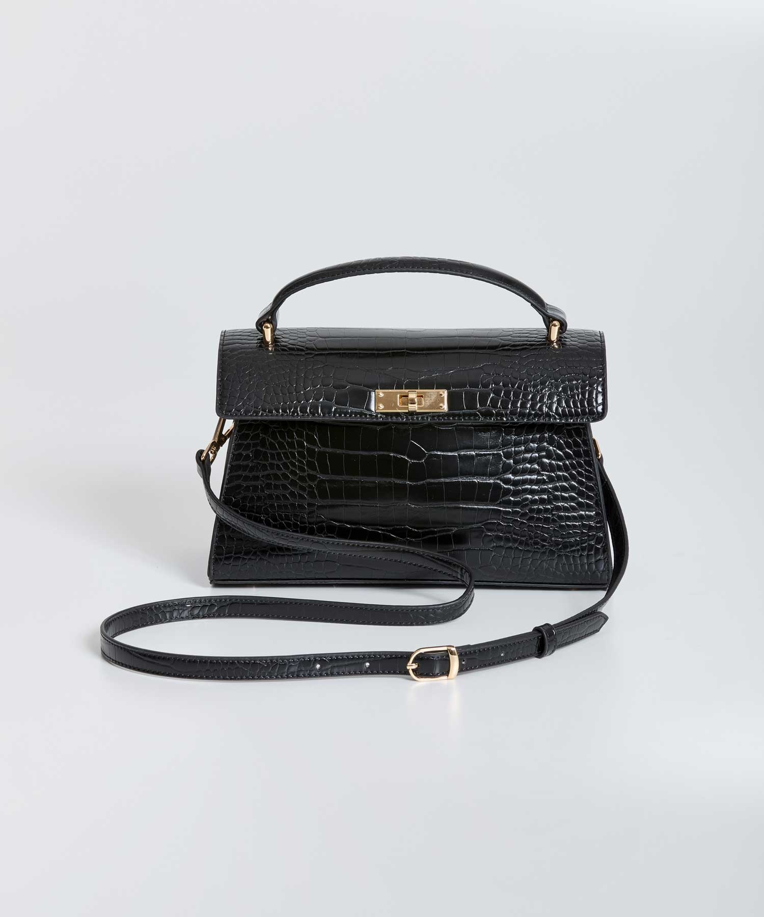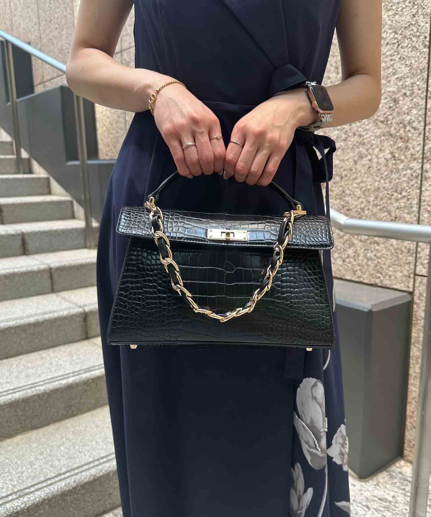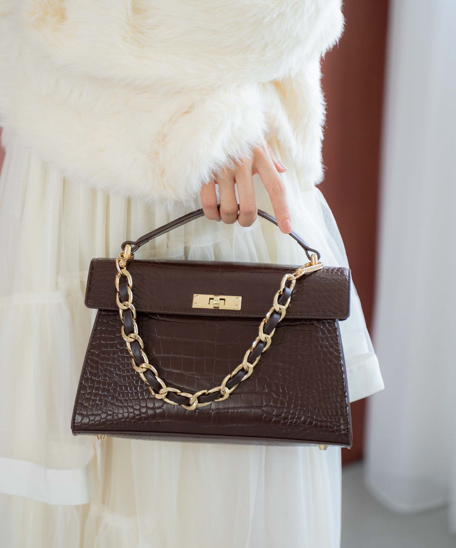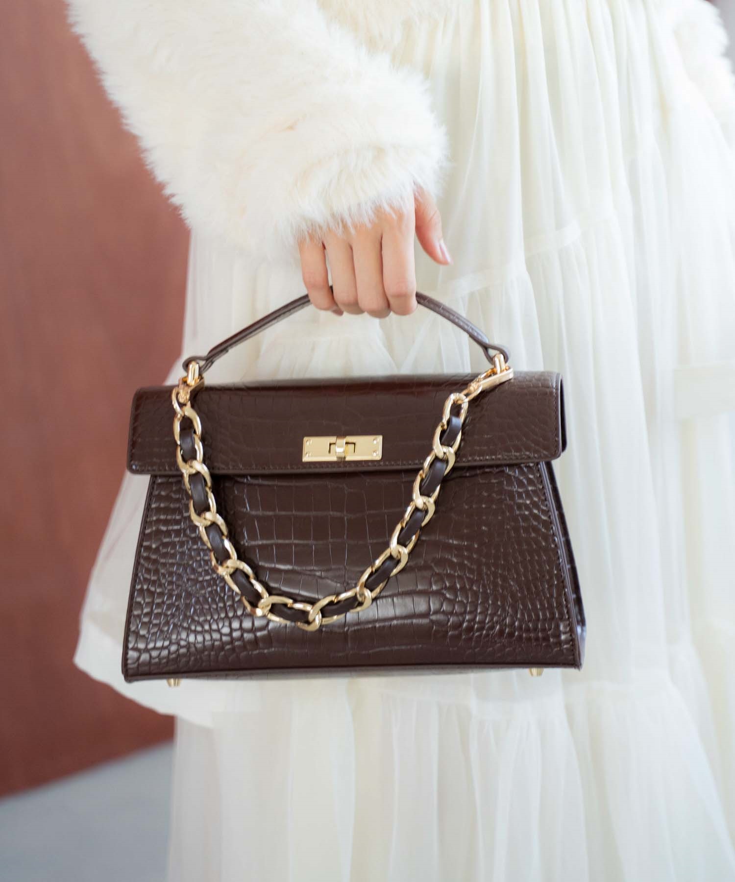 ほんのりツヤを帯びたクロコダイル風の型押し素材に、ゴールドの金具が映える、クラシックでリッチな表情のハンドバッグ。