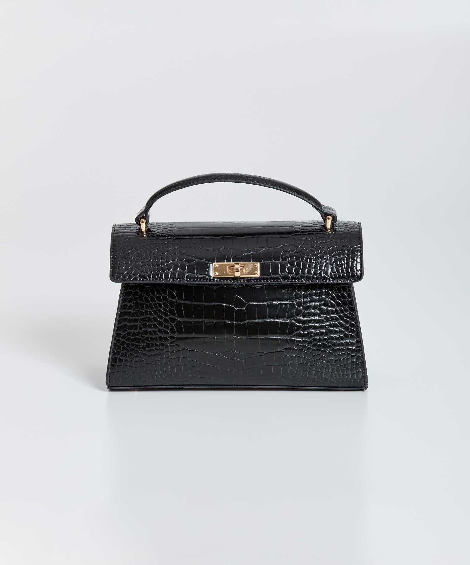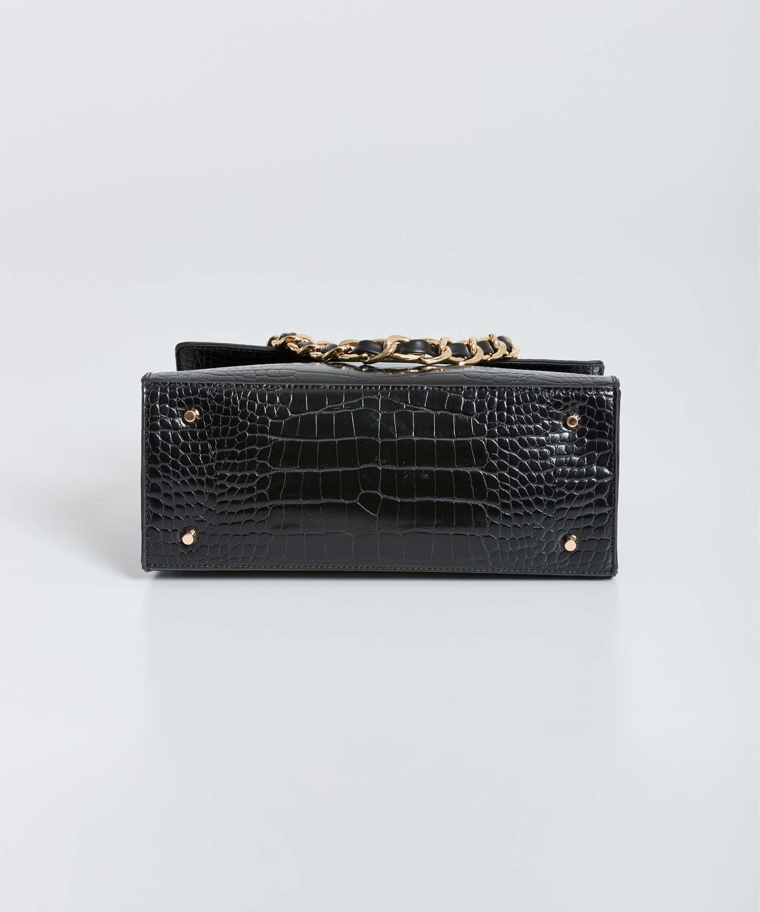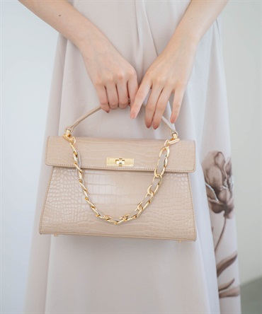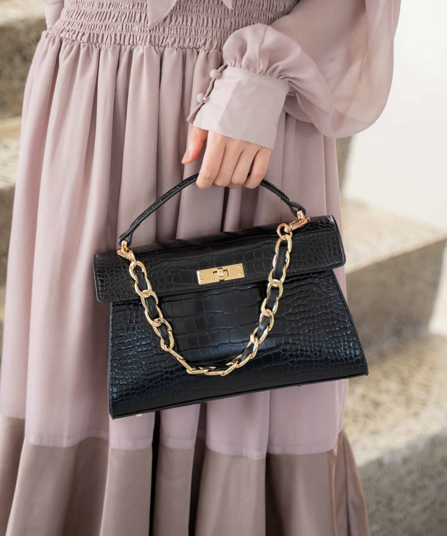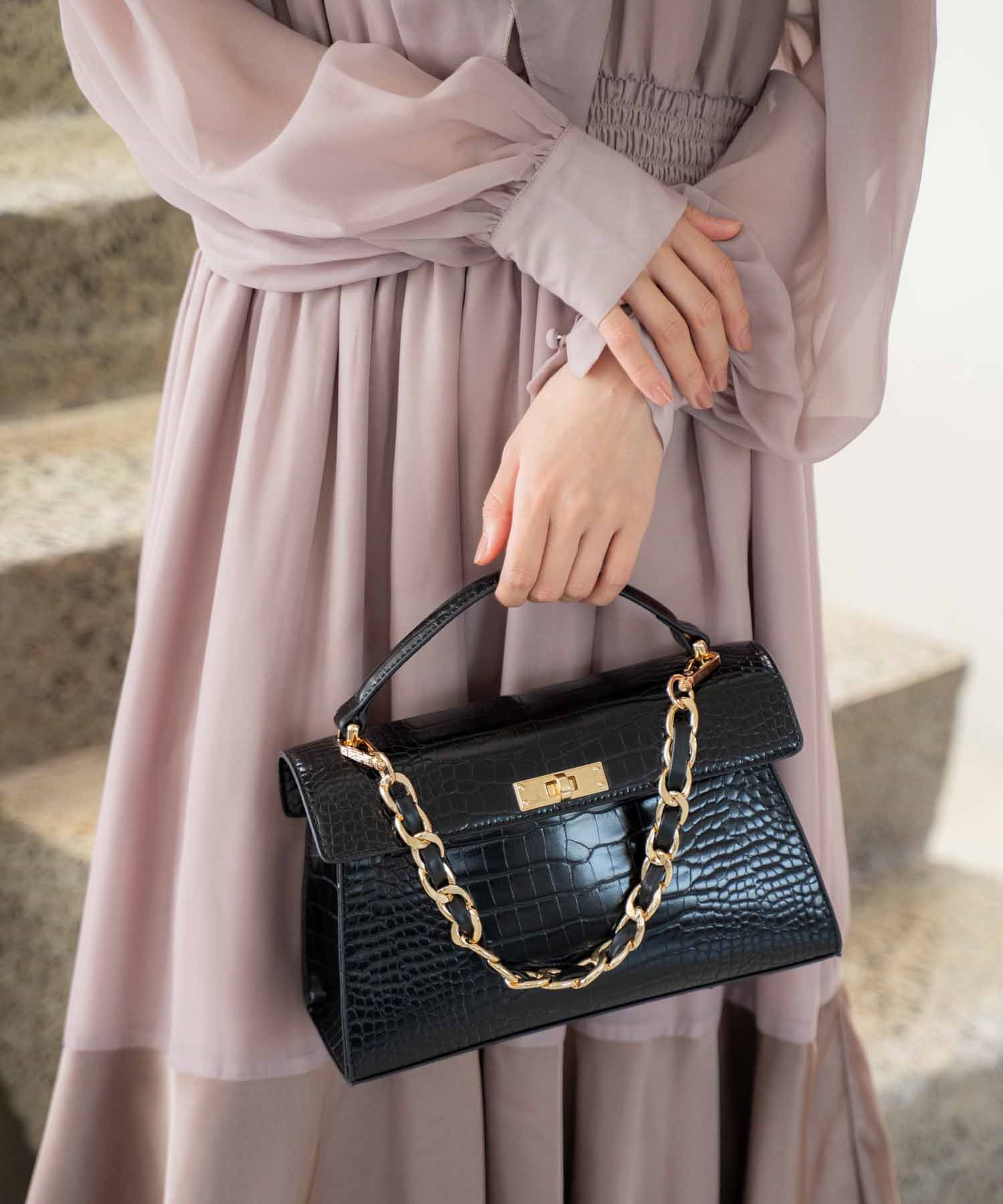 ほんのりツヤを帯びたクロコダイル風の型押し素材に、ゴールドの金具が映える、クラシックでリッチな表情のハンドバッグ。