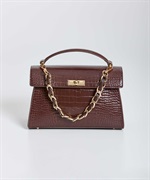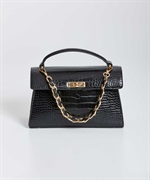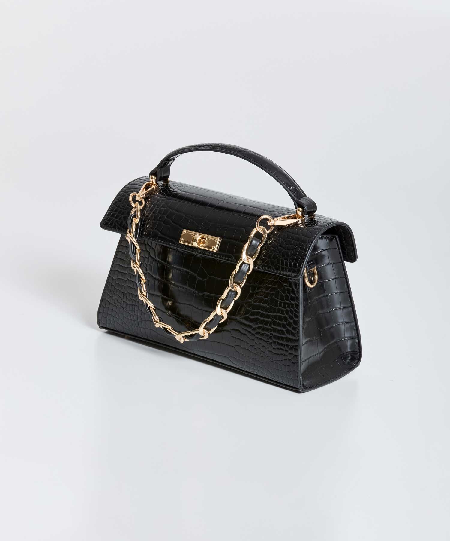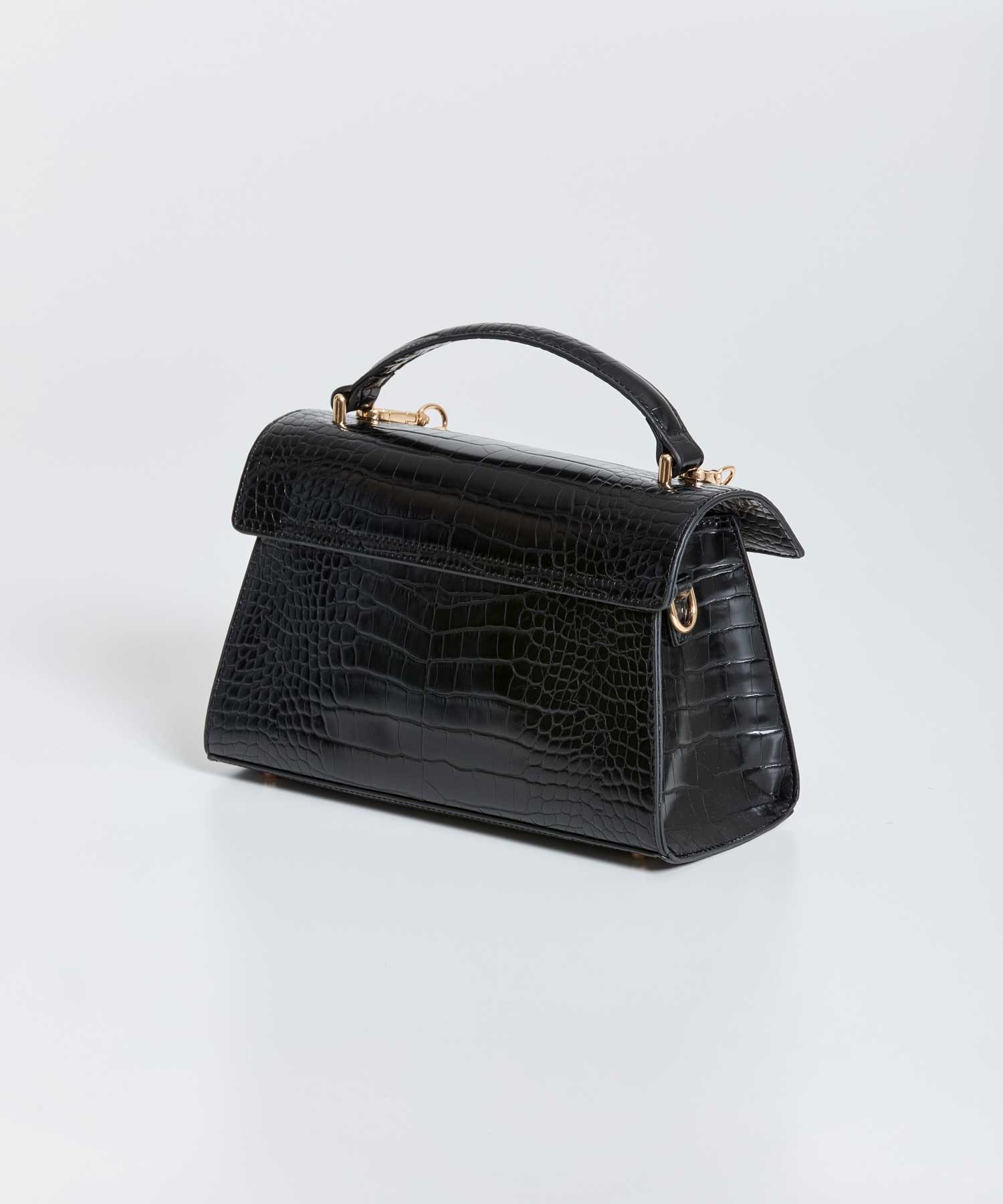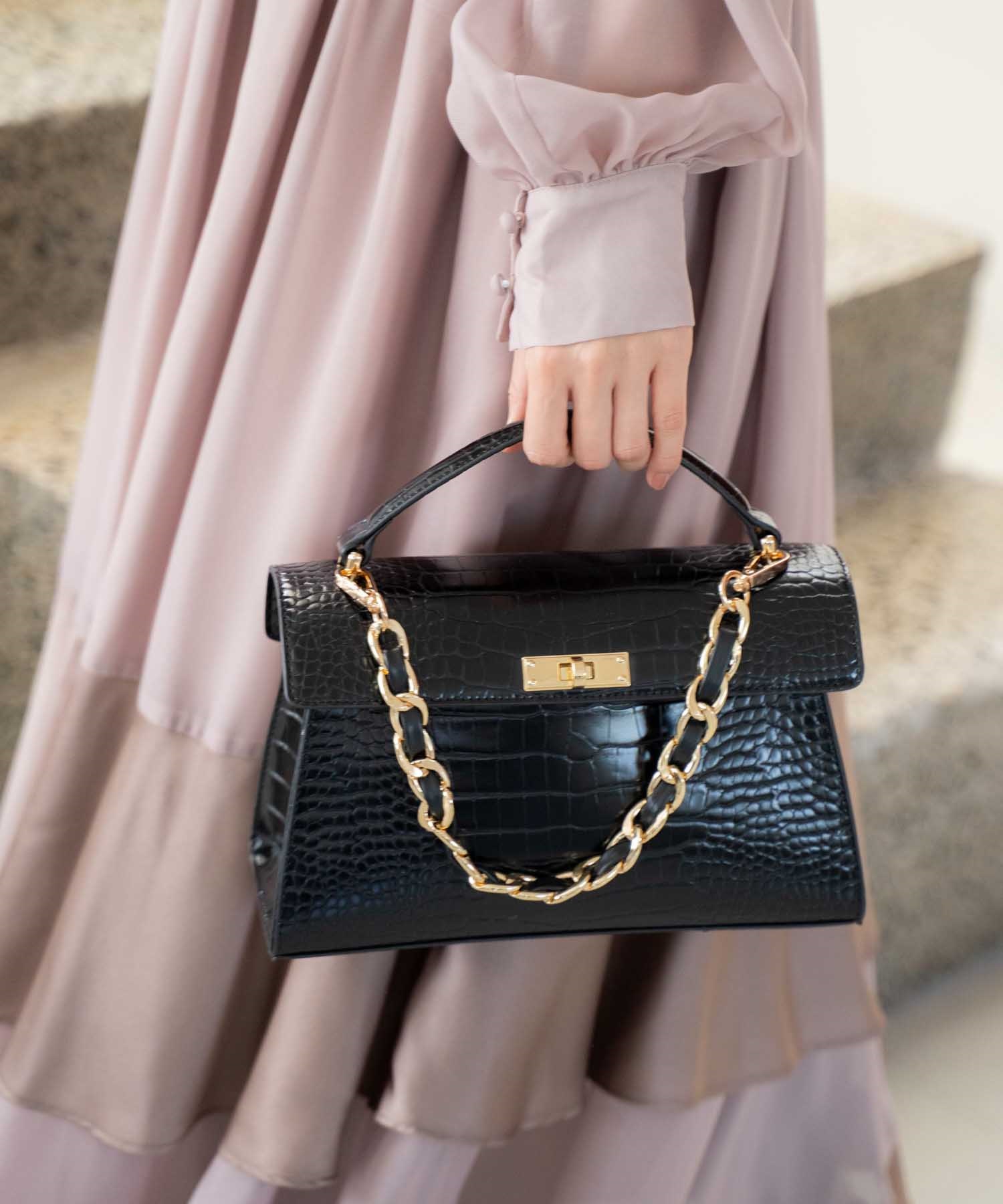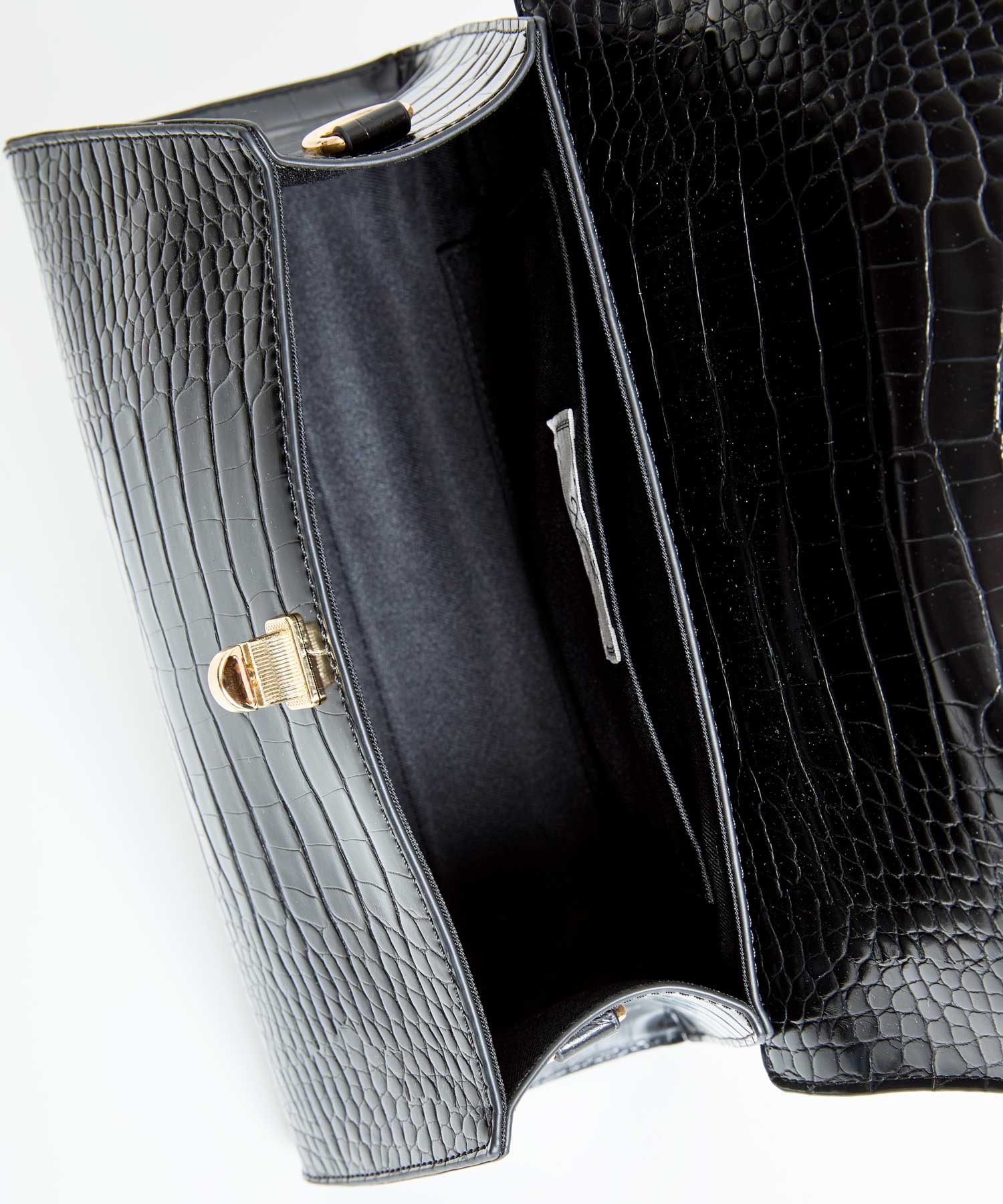 ほんのりツヤを帯びたクロコダイル風の型押し素材に、ゴールドの金具が映える、クラシックでリッチな表情のハンドバッグ。