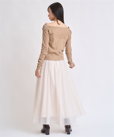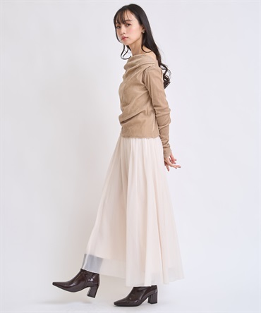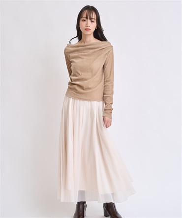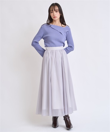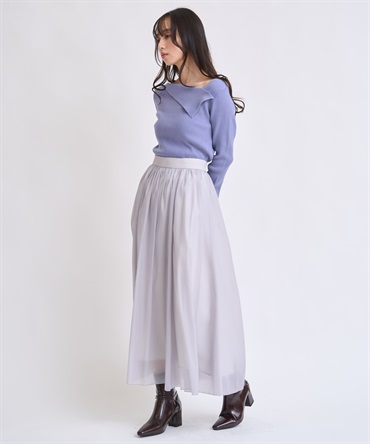 ざっくりしたニットと合わせて、カジュアルながらも女性らしい柔らかさを演出。