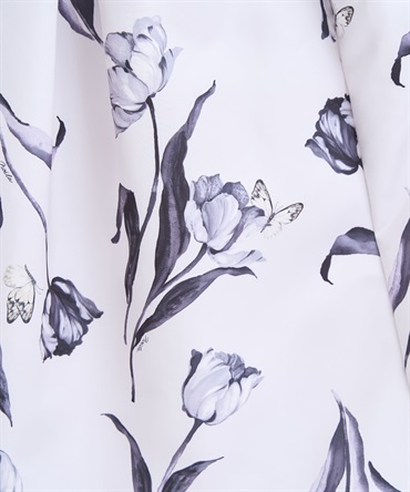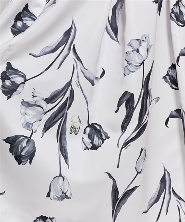 中肉のマットサテンがふわっと広がる美しいシルエットを叶え、動くたびに軽やかな印象に。